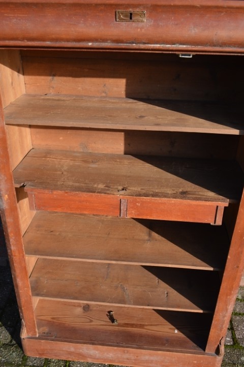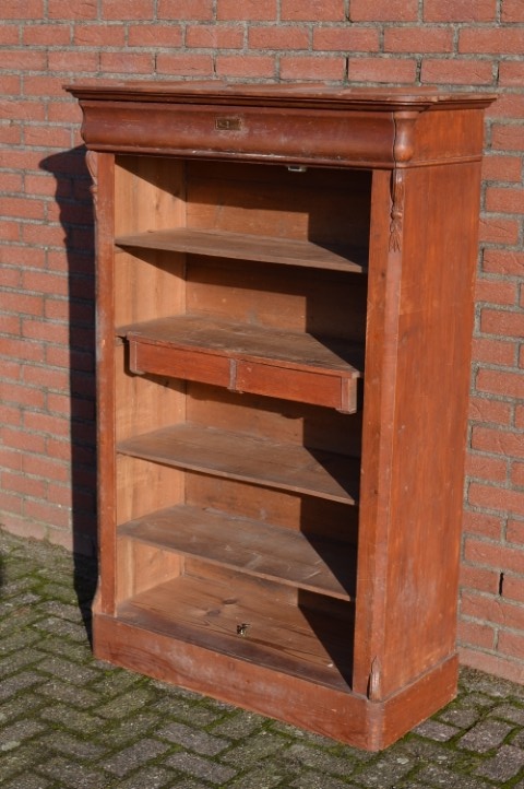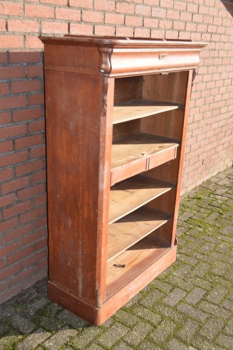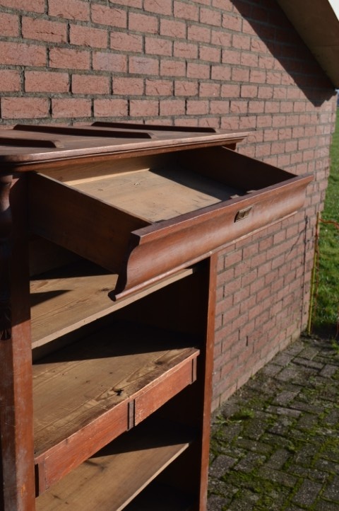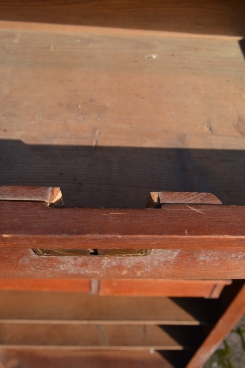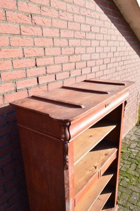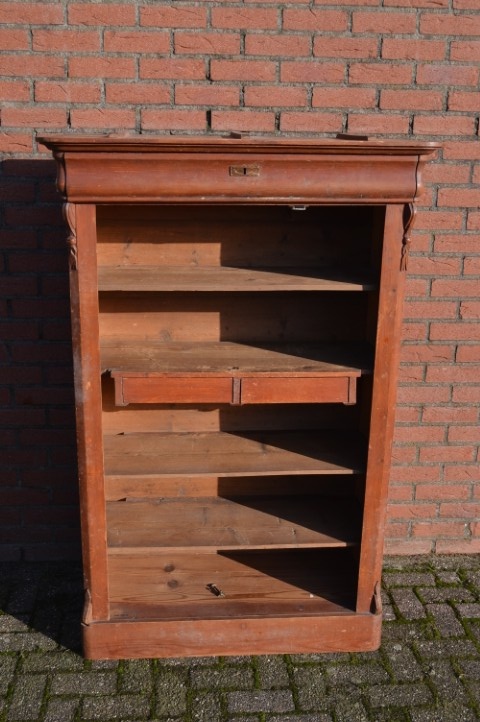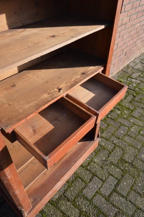 Het is een oude brocante kast met gebruikssporen. Er zijn geen deuren en er is geen slot in de lade en toch is het een kast met een prachtige uitstraling.