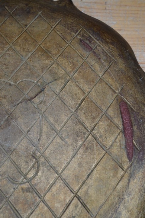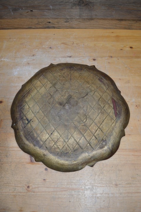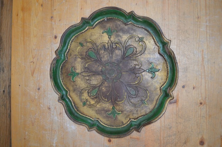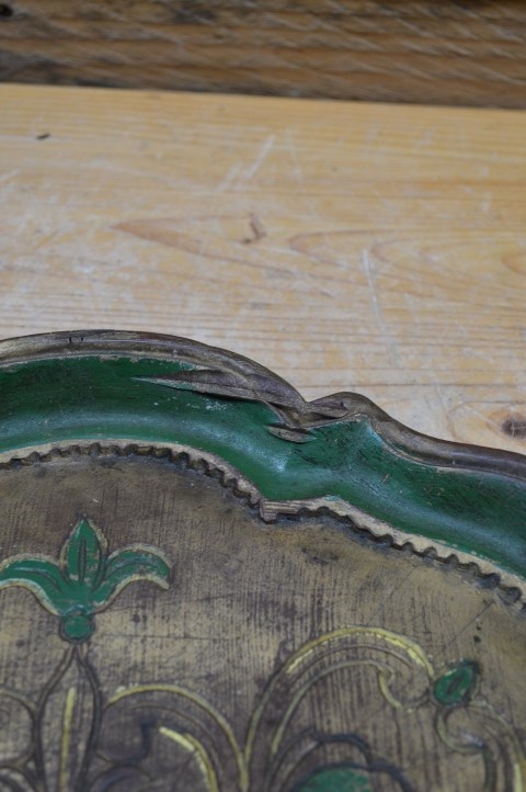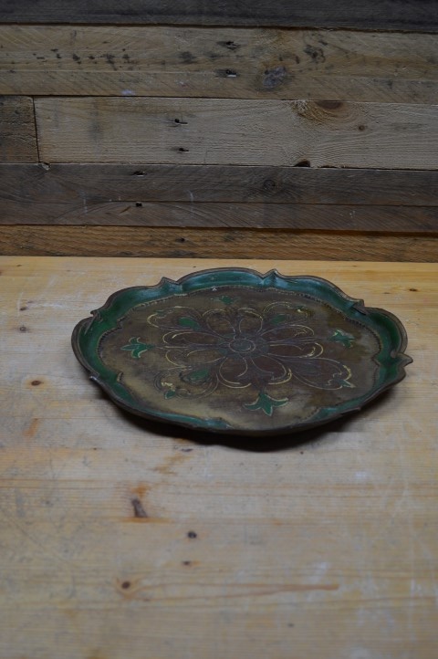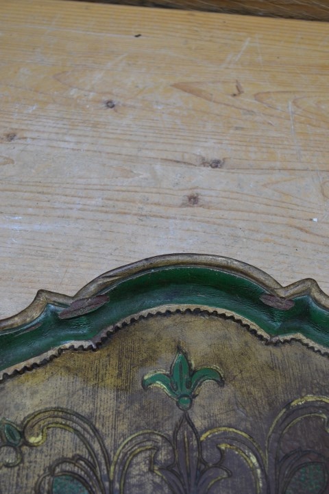 Dit groen en goudkleurige dienblad heeft door de jaren heen dan ook een aantal gebruikssporen opgepikt, het blad is niet meer vlak door vervorming van het materiaal. waarschijnlijk iets van kunststof