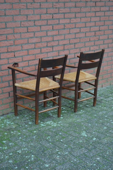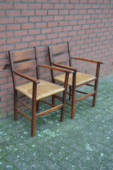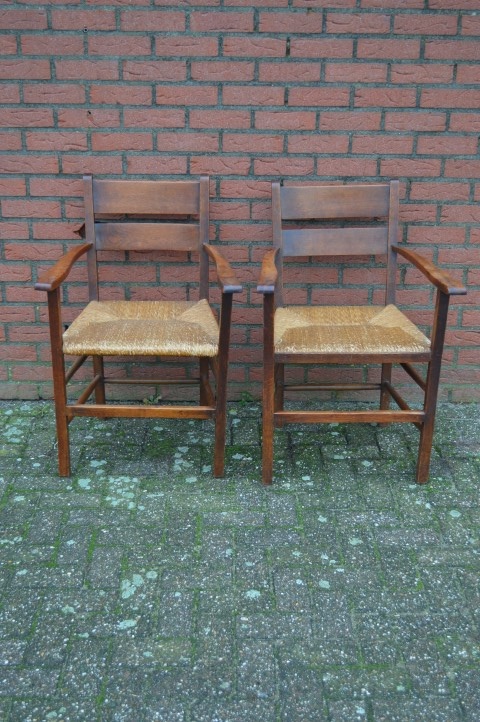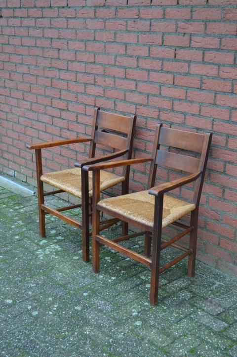 Twee zeer mooie oude eiken armstoelen met biezen mat. Deze stoelen kunnen zowel solitair als fauteuils gebruikt worden als bij een eettafel als luxe eetkamerstoel. Deze twee stoelen passen bij elk interieur door hun neutrale uitstraling. Vaak worden dit soort armstoelen op het moment gepimpt door het hout in een mooie heldere kleur te verven.