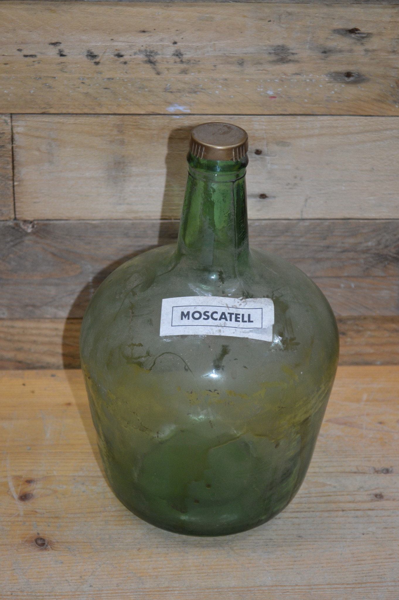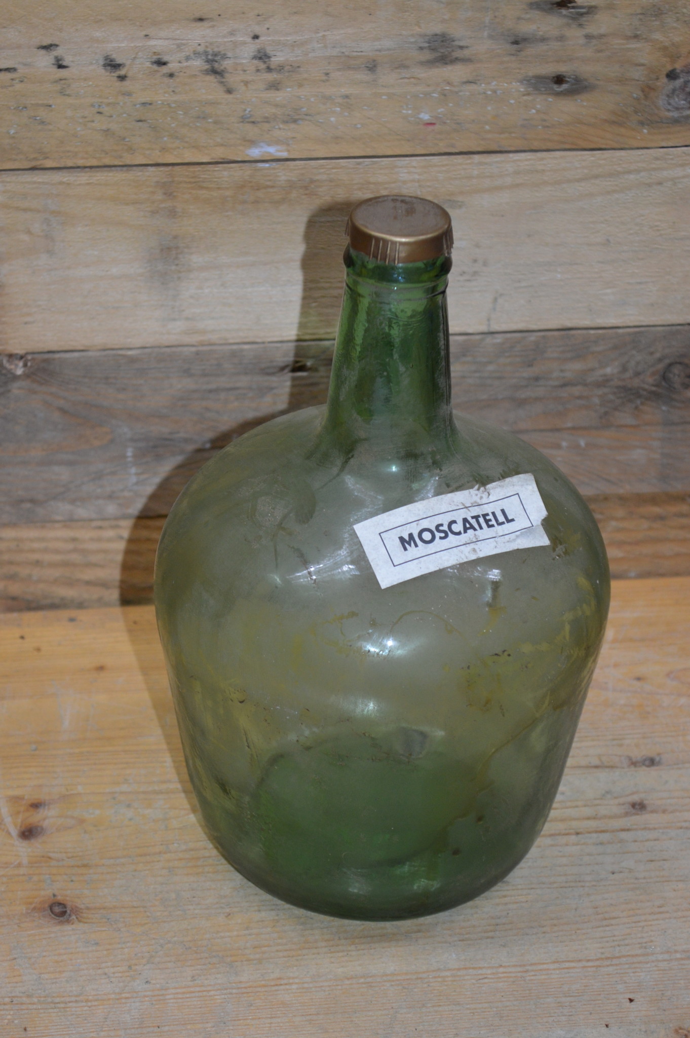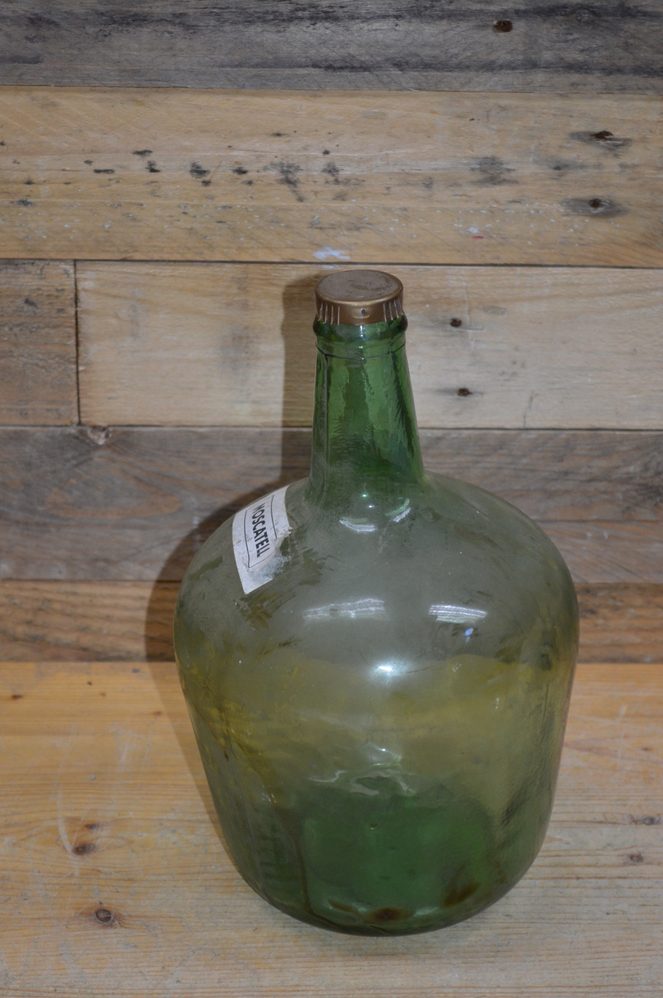 Deze oude bolle drankfles van groen glas is inmiddels leeg, maar beschikt over een dop en moscatell label en is de ideale decoratie om een dressoir of vensterbank mee op te fleuren, bijvoorbeeld door een gekleurde vloeistof of zand aan het flesje toe te voegen, maar ook zonder inhoud kan dit flesje een mooie aanvulling zijn op het interieur.