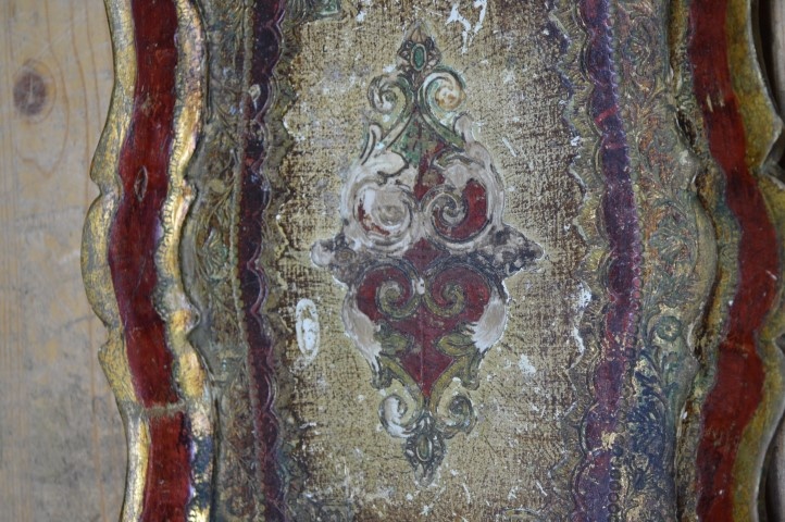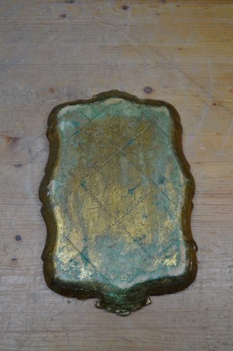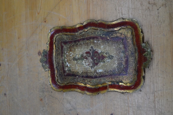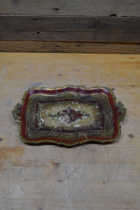 Dit goudkleurige dienblad heeft door de jaren heen dan ook een aantal gebruikssporen opgepikt, maar met de juiste aandacht en liefde kan dit prachtig versierde houten dienblad een sierlijke toevoeging zijn aan elk interieur.