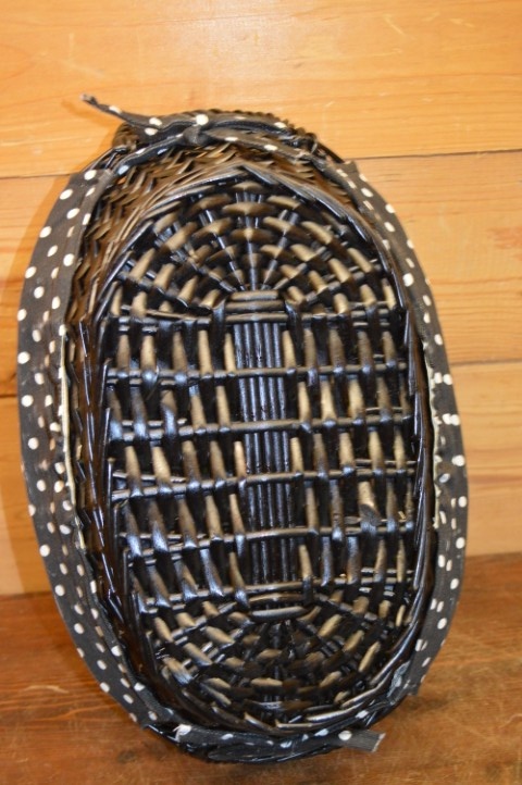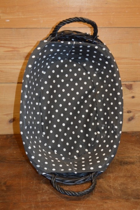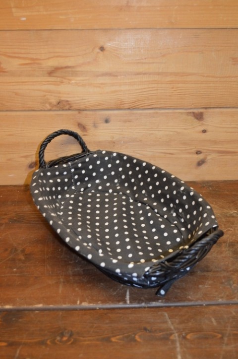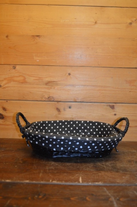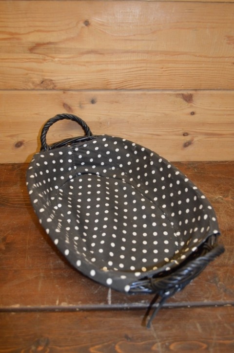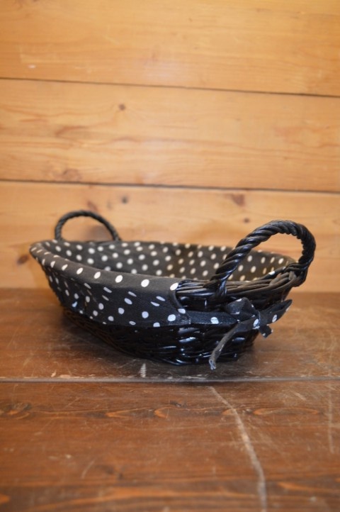 Dit ovaal zwart mandje is gevlochten van wilgentenen en heeft handige handgreepjes. Het binnenste is bekleed met een zwart-wit gestippeld doekje dat zorgt voor een speels accent. Perfect als broodmandje, voor paasdecoratie met gekleurde eitjes of als stijlvol tafeldecoratief element.