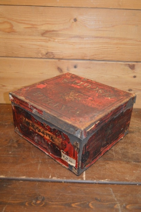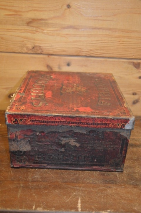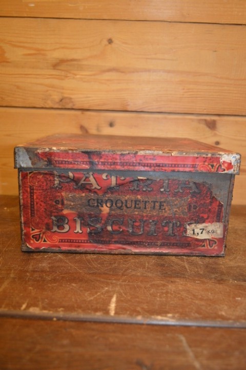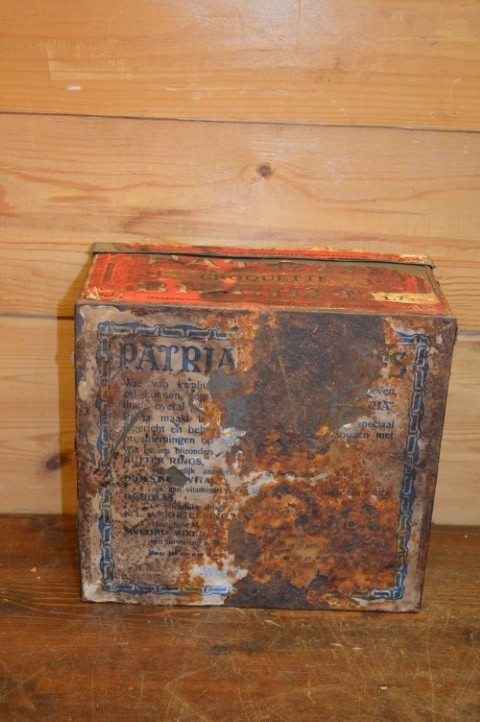 De deksel sluit goed, en de sporen van gebruik tonen de leeftijd en authenticiteit van dit bijzondere verzamelobject. Een ideaal stuk voor liefhebbers van oud verpakkingsmateriaal, retro decoratie of Nederlandse industriële geschiedenis.
