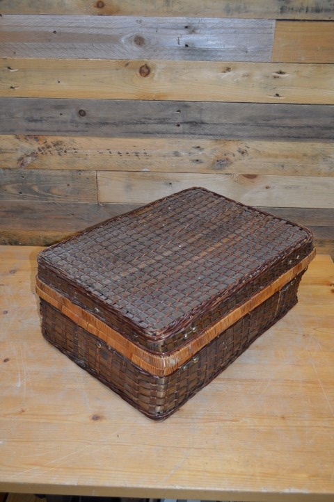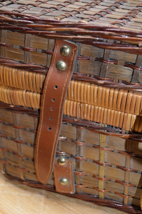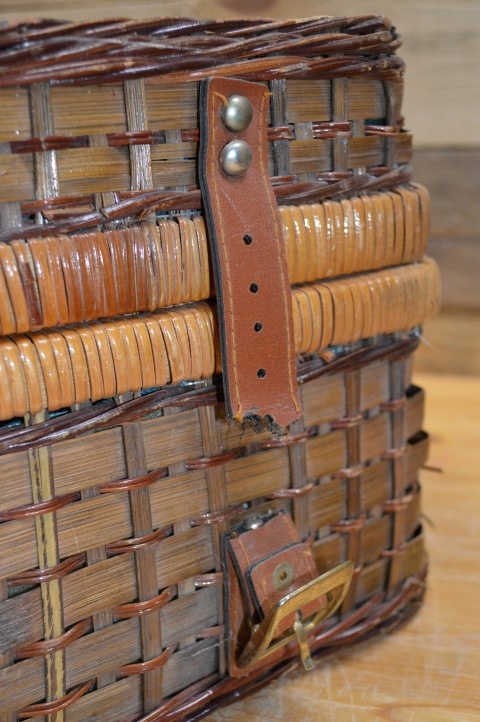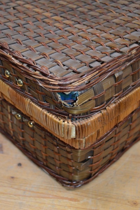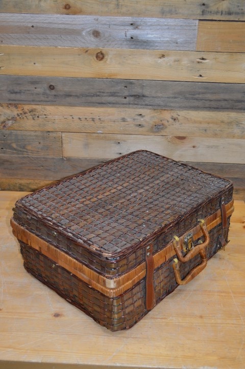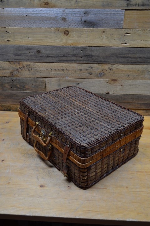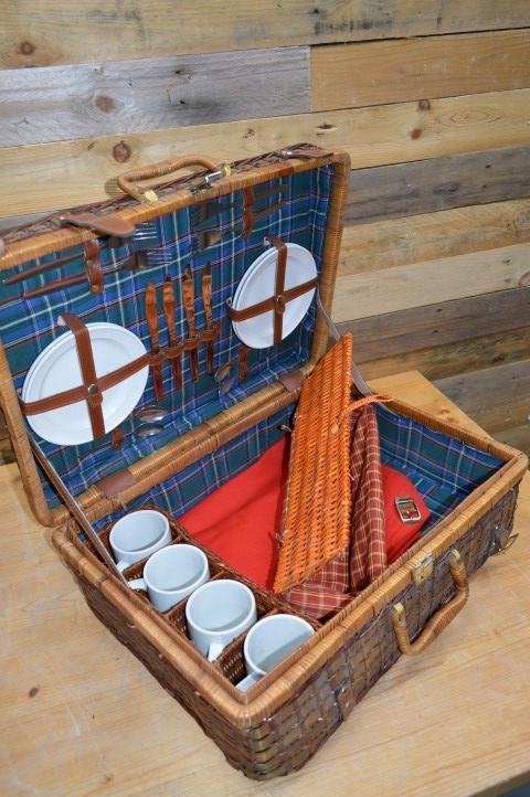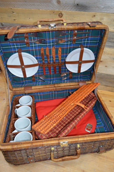 Deze mooie gevlochten picknickmand met inhoud is vormgegeven als een picknickkoffer en is dankzij de handige handvaten ideaal voor bij de picknick, op vakantie of als decoratie in huis. Op deze stevige picknickmand zijn wel enige gebruikssporen aanwezig, zoals te zien is op de foto's.