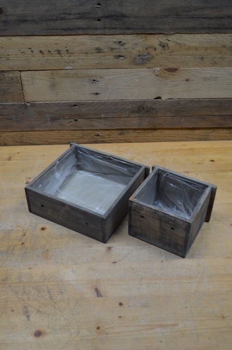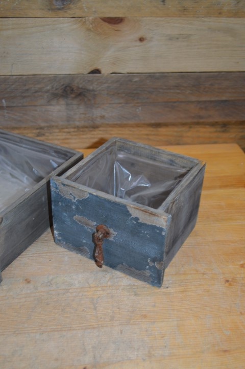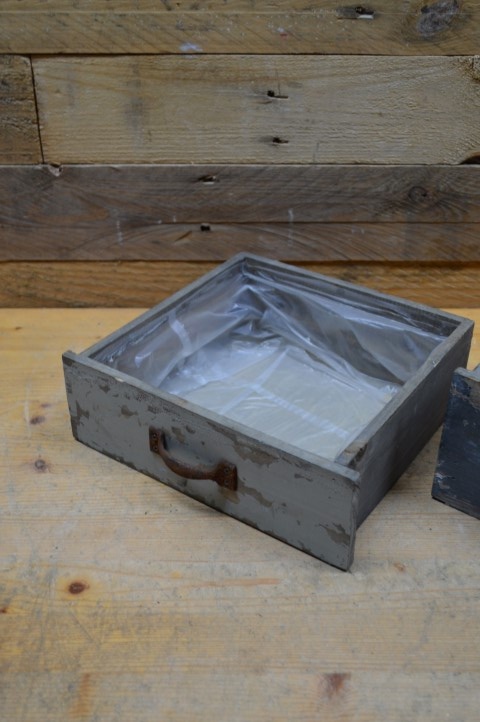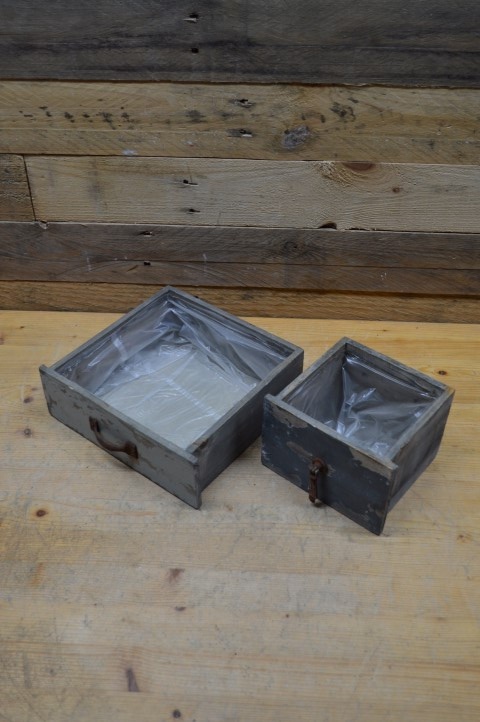 Het zijn tweedehands lades omgetoverd tot bloembak door ze van binnen te bekleden met plastic. Het zijn echt lades geweest en daarom hebben ze gebruikssporen