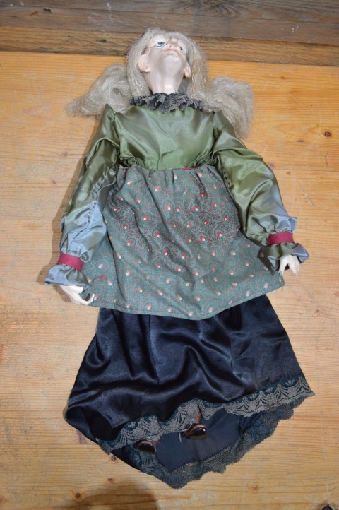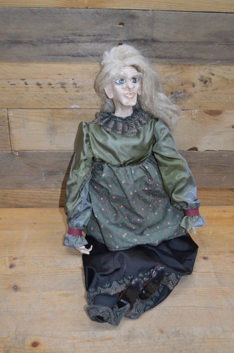 Oude heksenpop in klederdracht met verwarde lange losse haren. Deze landelijke pop is ideaal als ouderwetse decoratie in huis zoals op een kast, tafel of bij de deur en is leuk om te geven en te krijgen, bijvoorbeeld als ludiek cadeau aan uw schoonmoeder.