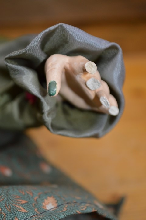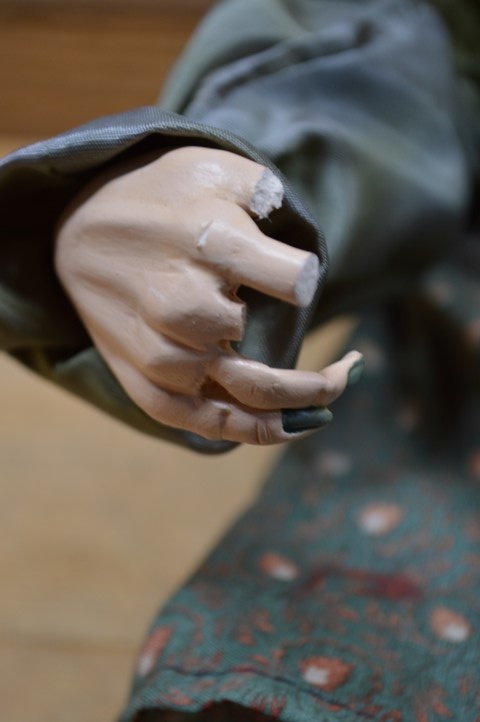 Omdat het een oude pop betreft zijn wel wat gebruikssporen achtergebleven, zo missen er een paar vingertjes, maar desondanks is deze prachtige landelijke heks nog steeds een uitstekende aanvulling op het interieur.