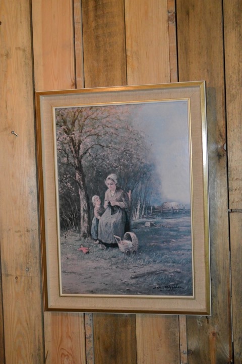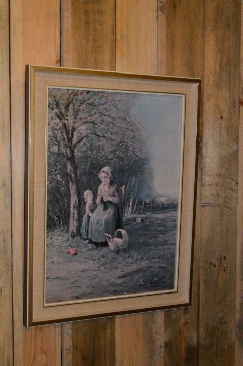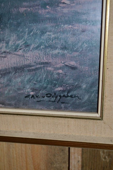 Het betreft drukwerk en geen schilderij. De poster is ingelijst in een vintage lijst en heeft gebruikssporen die passen bij de leeftijd en het karakter van het stuk.