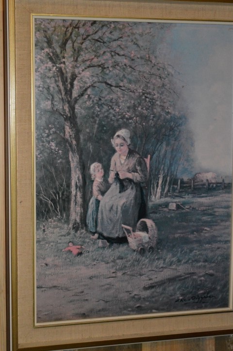 De voorstelling toont een vrouw in traditionele klederdracht die zit te breien, met haar dochter naast zich, geplaatst in een rustig landschap.