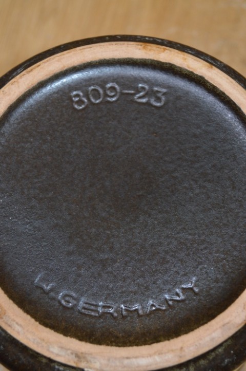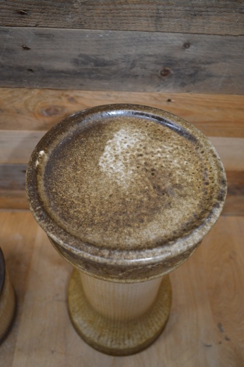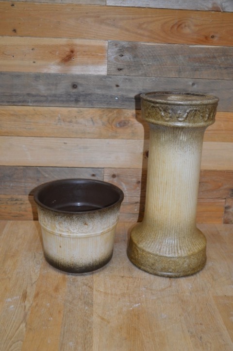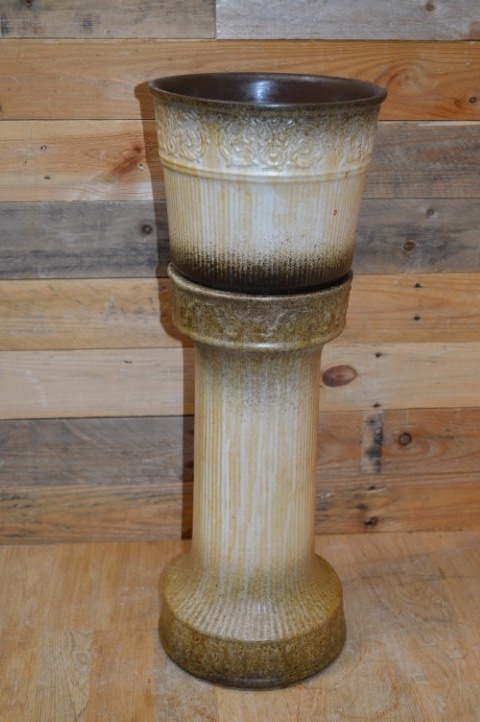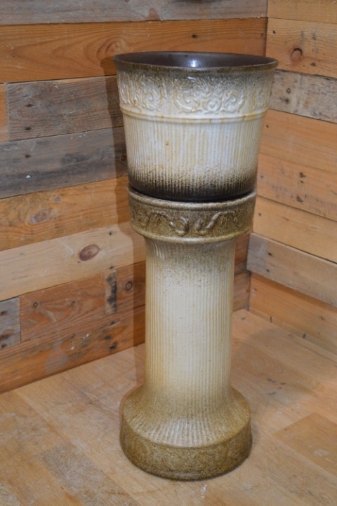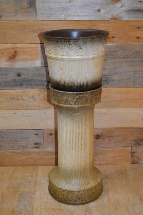 Deze keramische zuil met pot is een prachtig staaltje vintage West-Duits aardewerk uit de twintigste eeuw. Gemaakt door Wegmann (gemerkt: 809-23 / 512-45), valt deze set op door het glazuur in warme beige tot bruine tinten die mooi in elkaar overlopen. De zuil fungeert als piedestal en laat de pot letterlijk en figuurlijk opvallen. Ideaal om te gebruiken als bloempot voor een kamerplant, droogboeket of als decoratief object op zich.