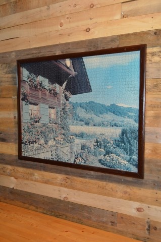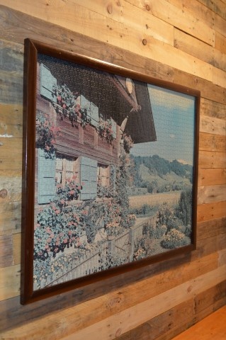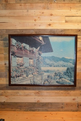Deze ingelijste puzzel van een Tiroler huis in de bergen is de perfecte wanddecoratie voor in huis. Ze fleurt de slaapkamer of woonkamer op en kan overal goed hangen dankzij de stevige donker gelakte massief houten lijst. Ondanks enkele gebruikssporen tijdens eerder gebruik, blijft deze puzzel een charmante decoratie en een mooie blikvanger in elk interieur.
