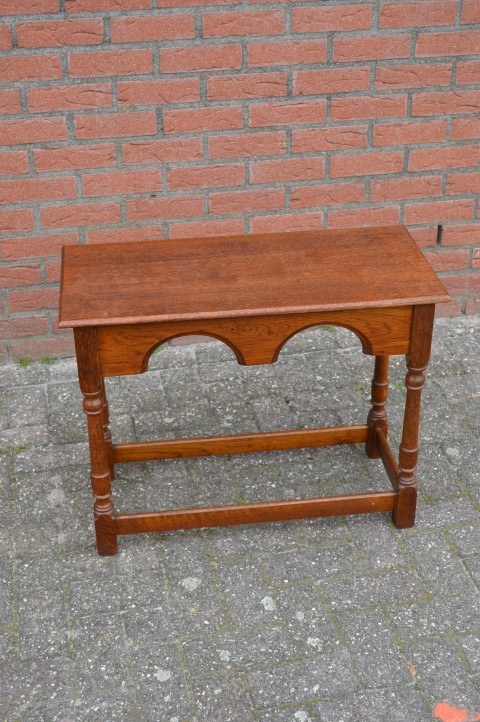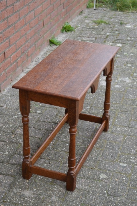 Dit prachtige rechthoekige bijzettafeltje van donker eiken is ideaal om een leuk plantje of een decoratie op neer te zetten en staat erg goed in bijvoorbeeld de woonkamer of slaapkamer. Het tafeltje heeft gebruikssporen maar ziet er nog goed uit en dankzij het donkere eiken brengt u een stukje van die klassieke sfeer in huis.