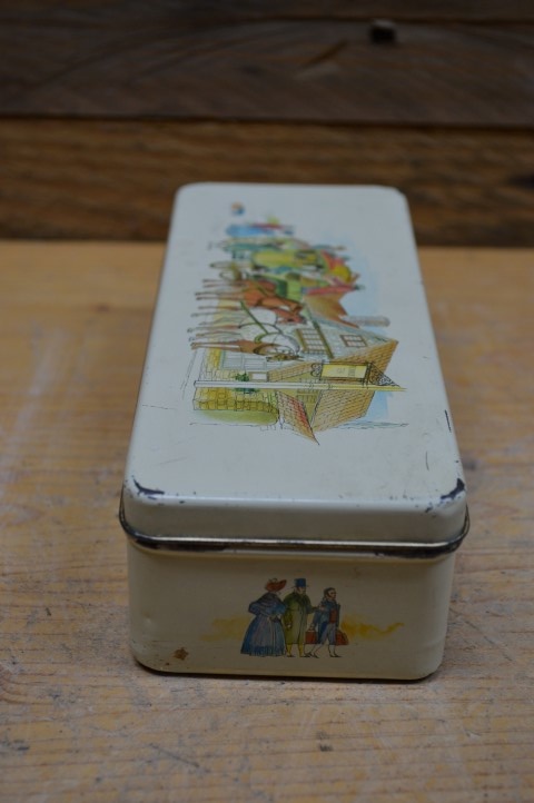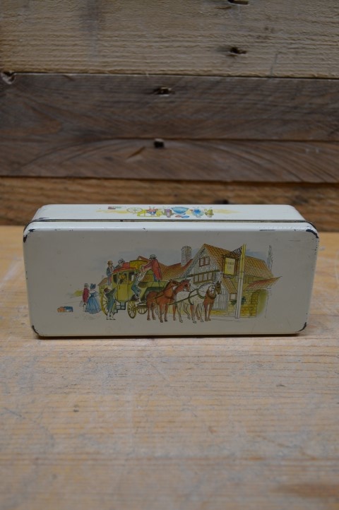 Prachtig rechthoekig PickWick blikje met opdruk van een familie die in een ouderwetse koets stappen. Leuk als decoratie op een dressoir of bijzettafeltje dankzij de vrolijke aquarelkleuren, maar ook erg handig als koekblik of om kleine spulletjes in te bewaren.