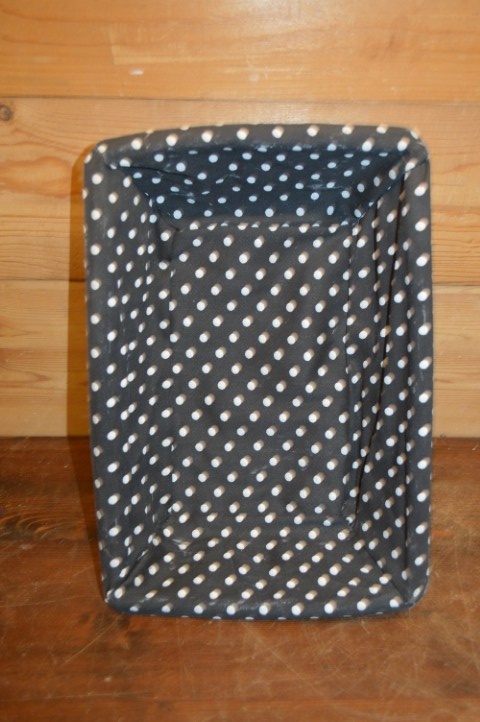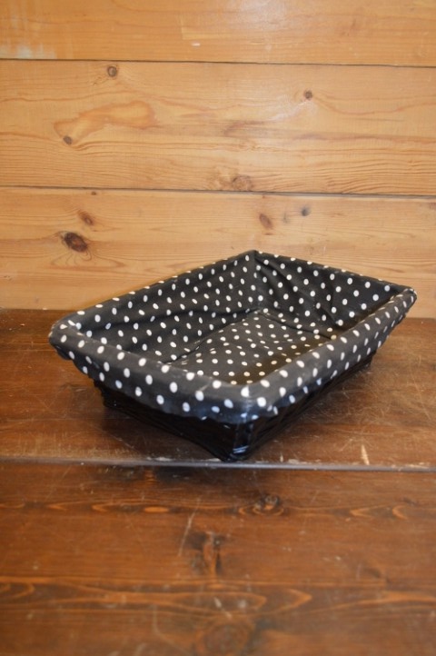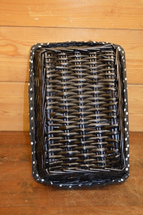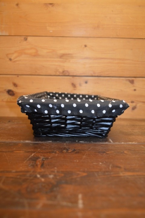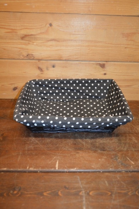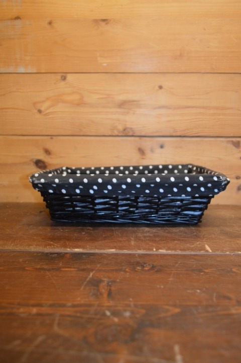 Dit rechthoekige zwarte mandje van wilgentenen heeft een stijlvolle zwart-wit gestippelde binnenvoering van textiel. Perfect als broodmandje, paasdecoratie of voor kleine spulletjes. De natuurlijke uitstraling van het gevlochten riet combineert prachtig met het contrasterende textiel. Tweedehands met lichte gebruikssporen, wat bijdraagt aan zijn authentieke charme.