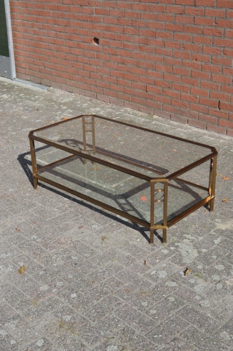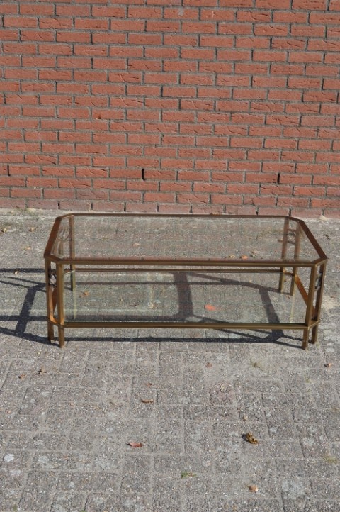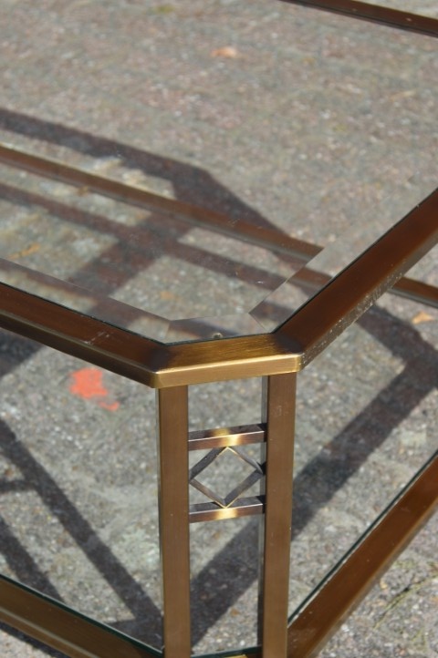 Deze langwerpige vintage salontafel in de stijl van Peter Ghyczy is uitgevoerd in geborsteld messing met twee facet geslepen glazen bladen. Het elegante design combineert perfect met zowel moderne als klassieke interieurs. Zowel het frame als het glas tonen gebruikssporen die passen bij de leeftijd en charme van dit meubel. De glasplaten zijn facet geslepen en vertonen krasjes, wat het authentieke karakter versterkt. Een bijzonder designstuk dat klasse toevoegt aan uw woonkamer.