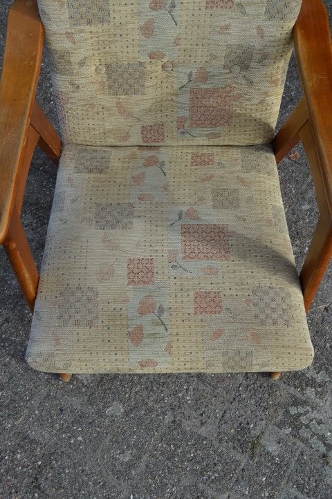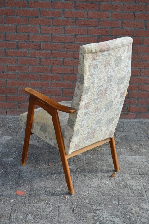Prachtige retro armfauteuil met geblokte stoffen bekleding en stevig houten frame. Deze mooie ouderwetse armstoel is ideaal om heerlijk in te ontspannen en staat overal in huis goed op zijn plek.