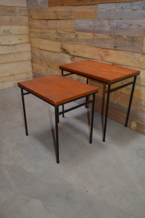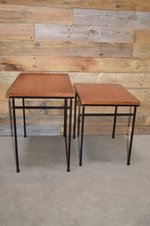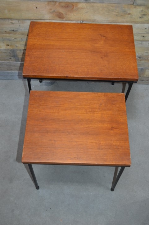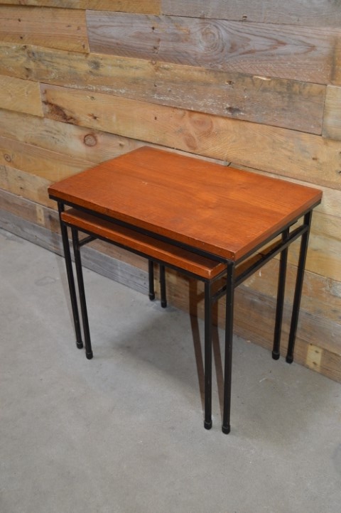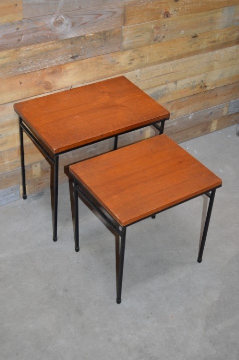 Deze retro Miniset uit de jaren sixties die bestaat uit twee tafeltjes. Teakfineer blad op stalen ranke pootjes geeft het een industriële look. Twee elkaar in grootte opvolgende tafeltjes die als een nestje in elkaar geschoven kunnen worden. Mooie hoog op de poten staande bijzettafeltjes die voor heel veel verschillende zaken kunnen worden gebruikt. De vintage nesttafeltjes passen altijd tussen twee stoelen of bij een salontafel. Mooi om een grote vaas of decoratie een extra accent te geven.