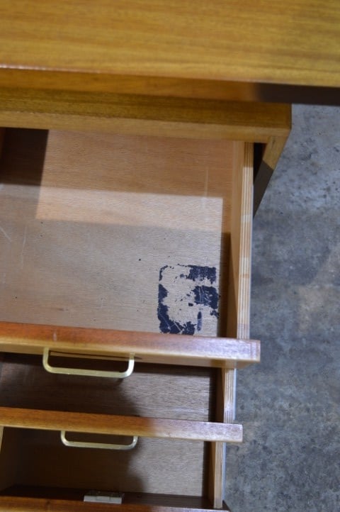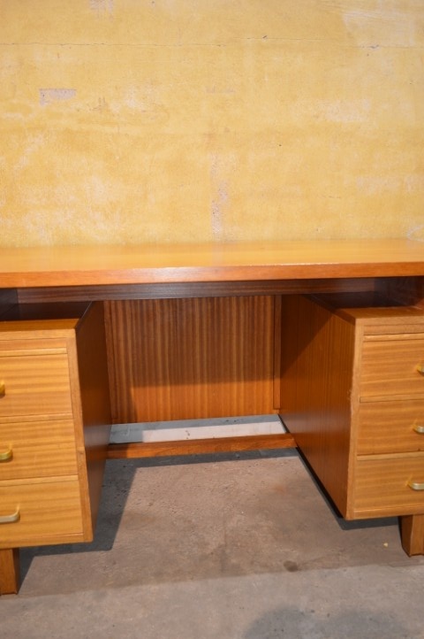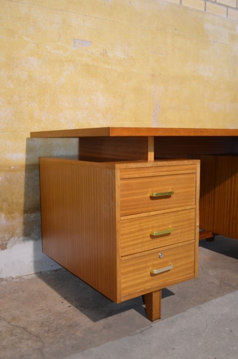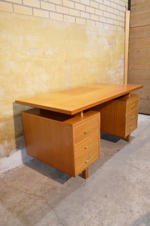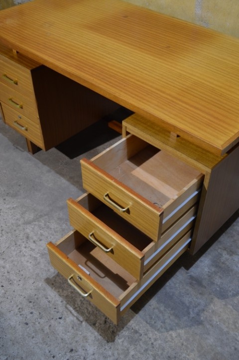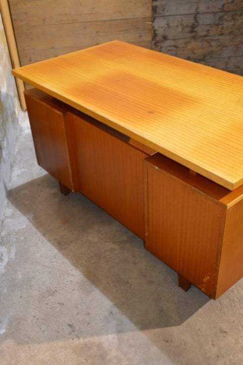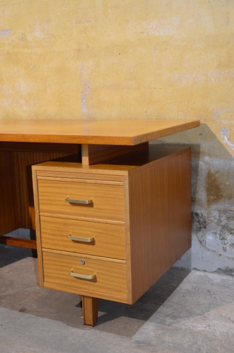 Gemaakt van beukenhout en multiplex heeft het bureau een warme uitstraling en een degelijke constructie die typerend is voor deze periode.