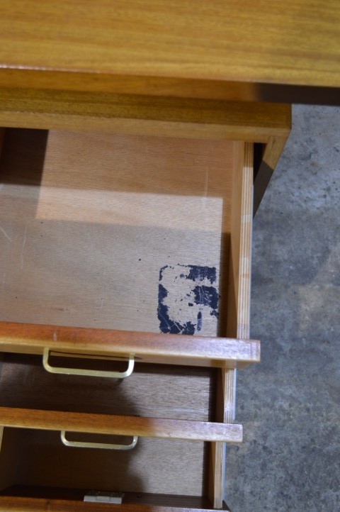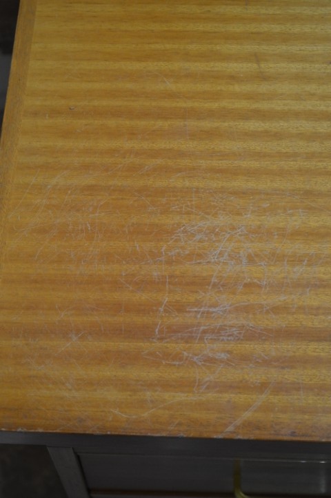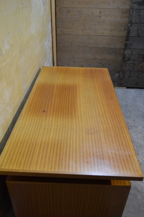 Het bureau vertoont gebruikssporen, verkleuringen en wordt geleverd zonder sleutels, passend bij de leeftijd en het gebruik.