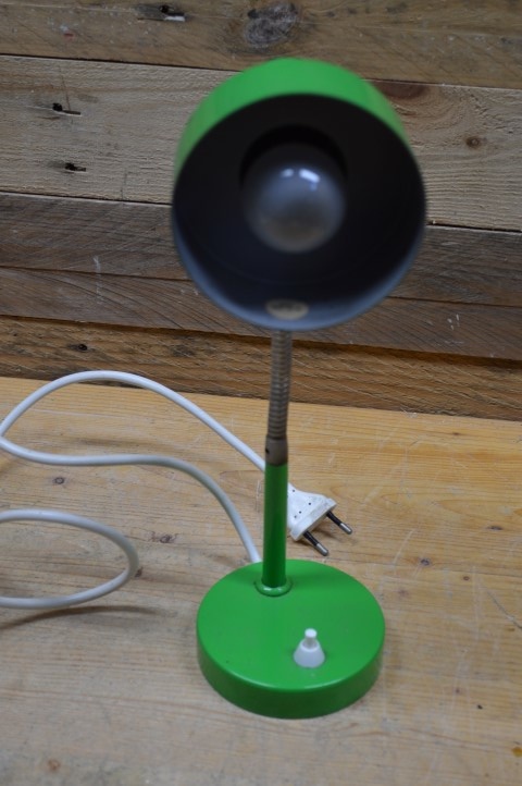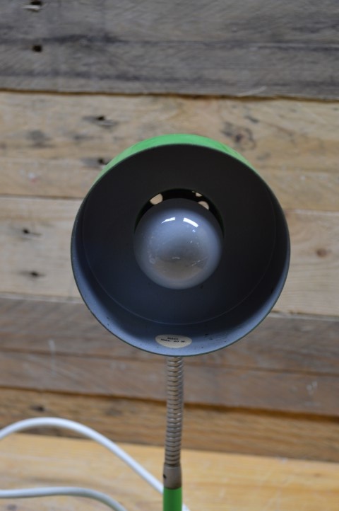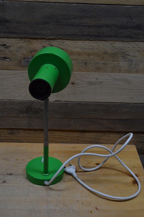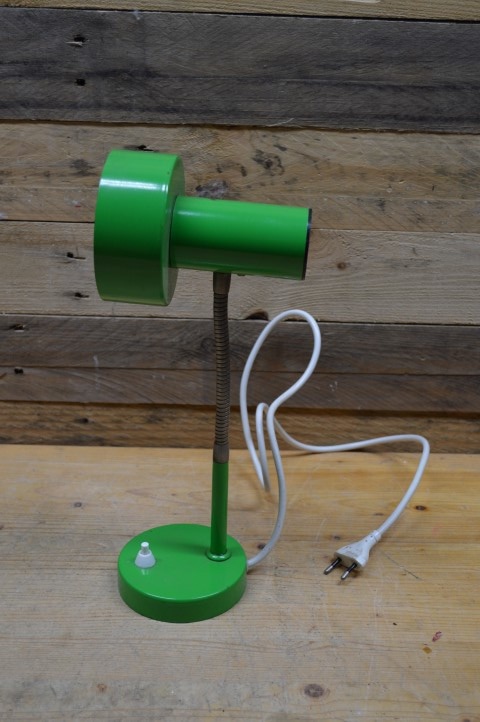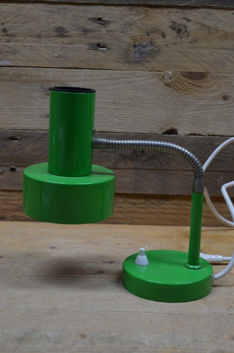 Mooie verstelbare retro bureaulamp van appelgroen metaal waarmee u ook 's avonds lekker door kunt blijven werken, zelfs als de avonden weer wat korter worden.