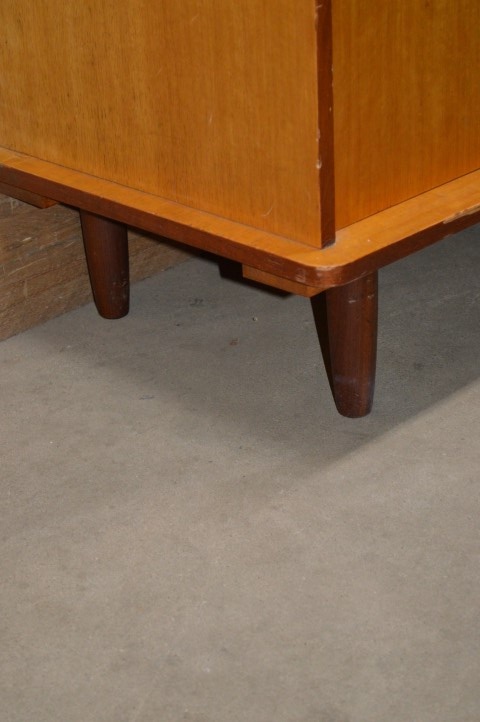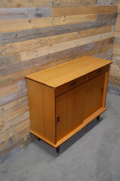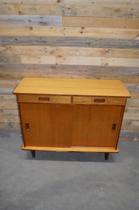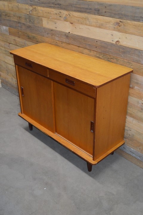Commode, licht in kleur en gewicht, met 2 openslaande deurtjes met een legplank en 2 soepel lopende laatjes. Schoenenkast uit de jaren 50 in essenfineer met twee schuifdeuren, twee massieve laden en typisch voor de mid century jaren schuine poten. Het superleuke vintage kastje op pootjes in een lichte houtkleur brengt meteen sfeer in de ruimte. Leuk voor de kinderkamer, of met een aankleedkussen als commode!