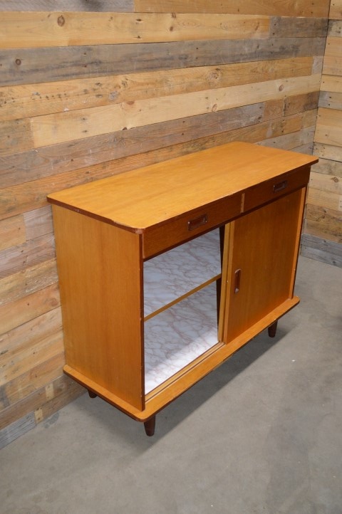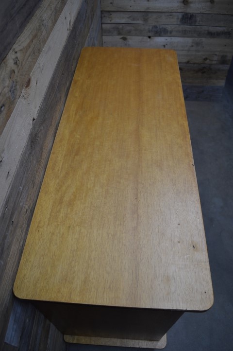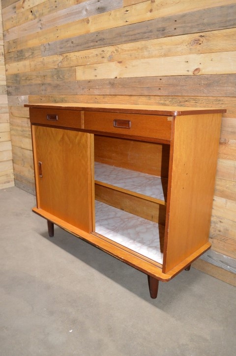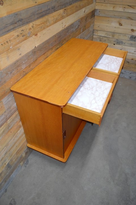 Het retro kastje is in goede staat, het blad heeft kleine sporen van gebruik.