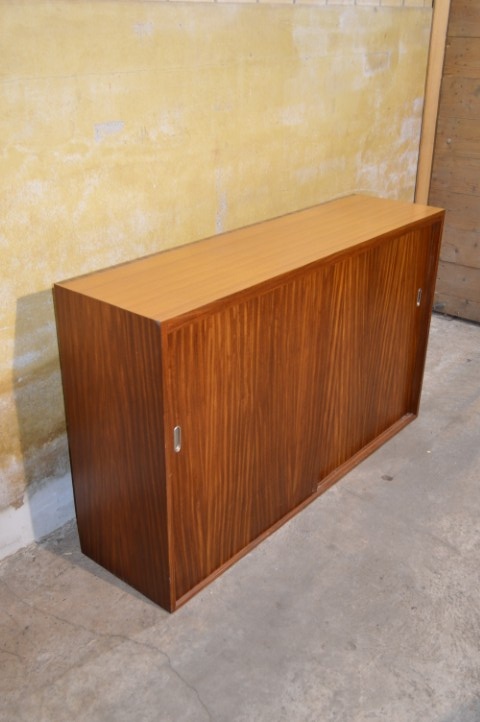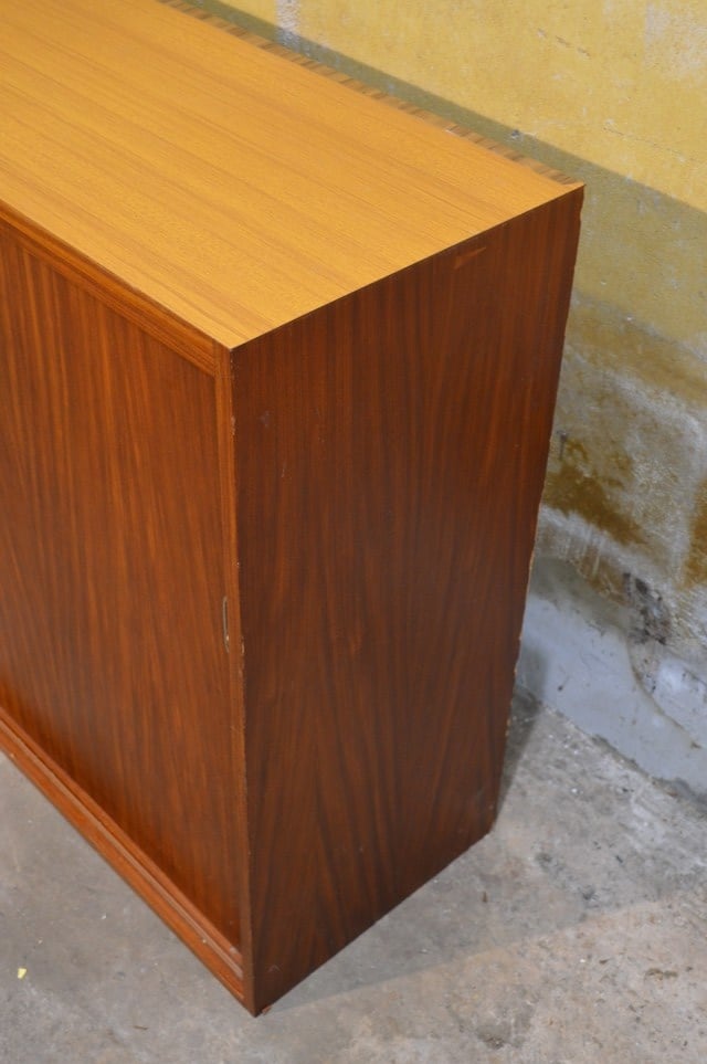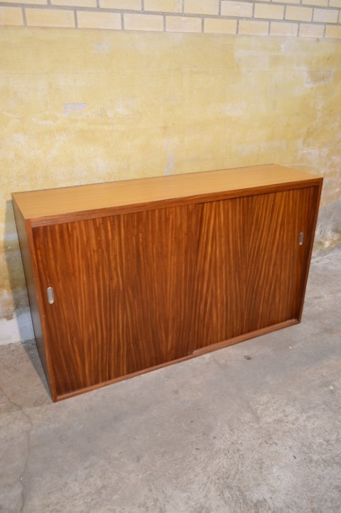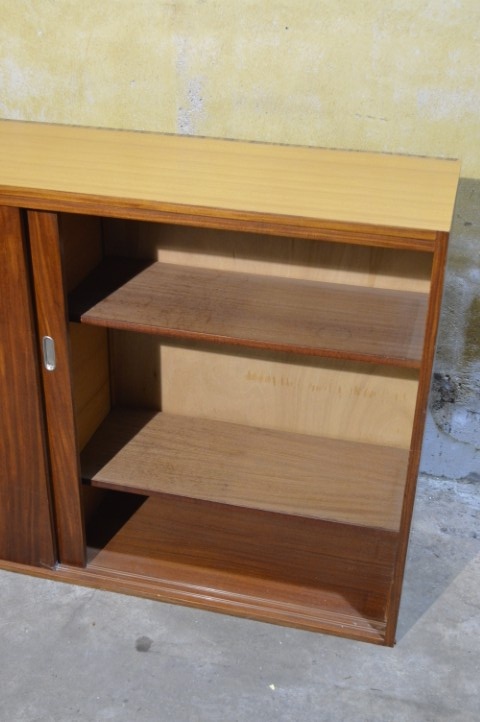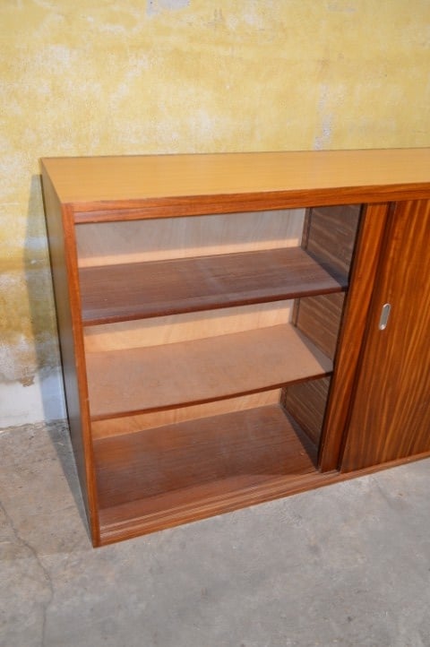Dit retro Scandinavisch dressoir is een compact en veelzijdig meubel. Dankzij de combinatie van een deur en open vakken is het geschikt als dressoir, tv-meubel of opbergkast.