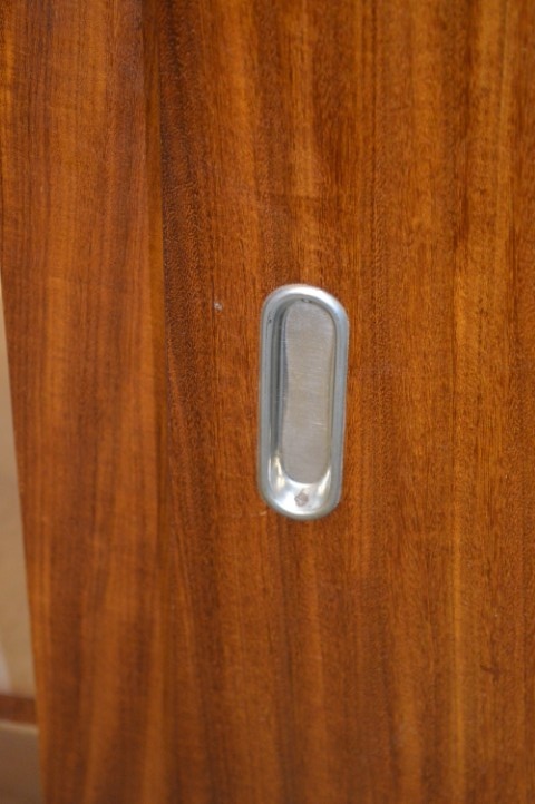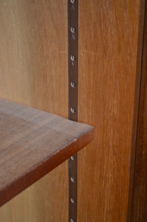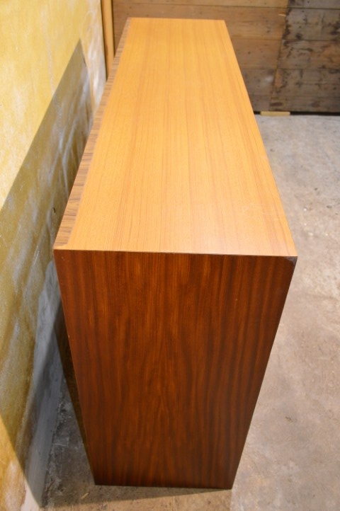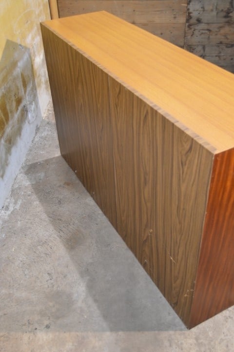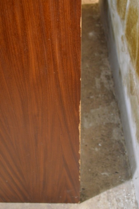 De kast is tweedehands en heeft gebruikssporen, waaronder een beschadiging aan de rand. De achterwand is beplakt met houtkleurig fineer.