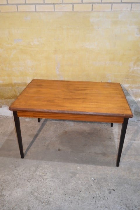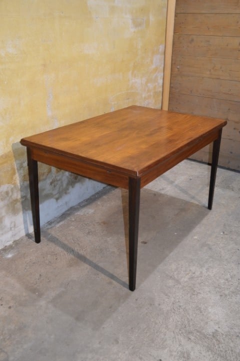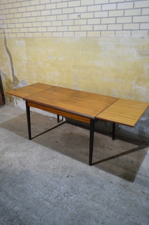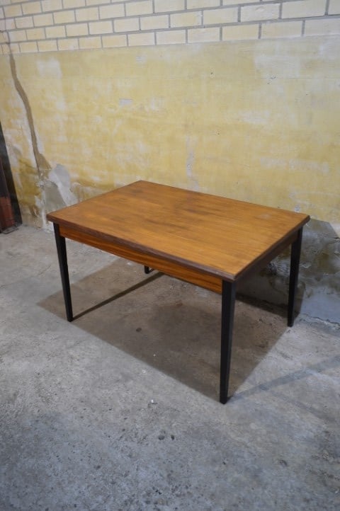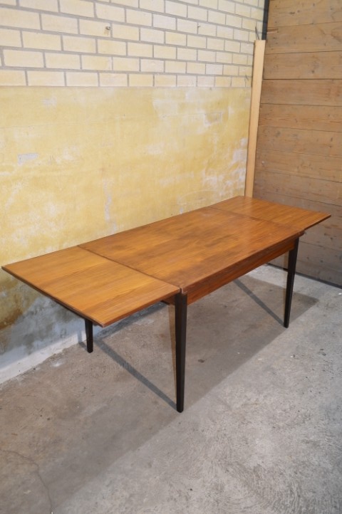 Deze retro teakhouten eettafel uit de jaren 60 is uitschuifbaar en daardoor ideaal wanneer er extra gasten aanschuiven. Ingeschoven meet de tafel L 124 x B 83 x H 74 cm en uitgeschoven L 213 cm.
