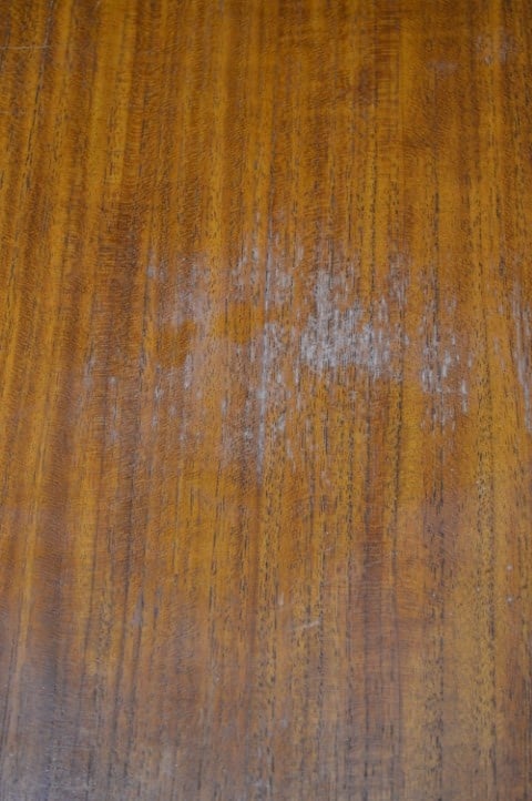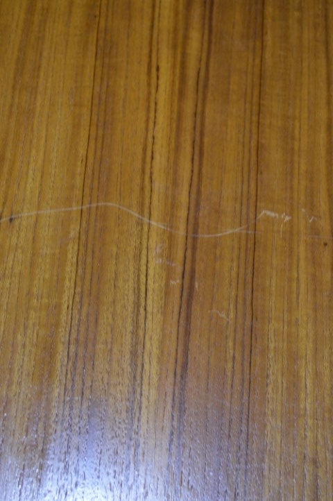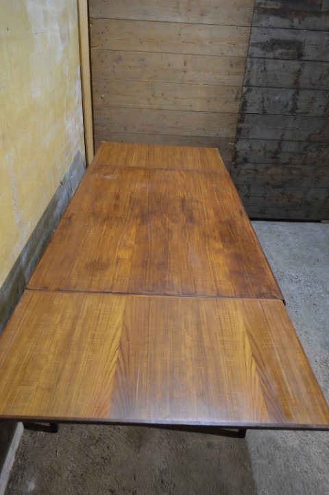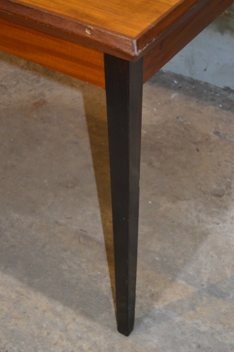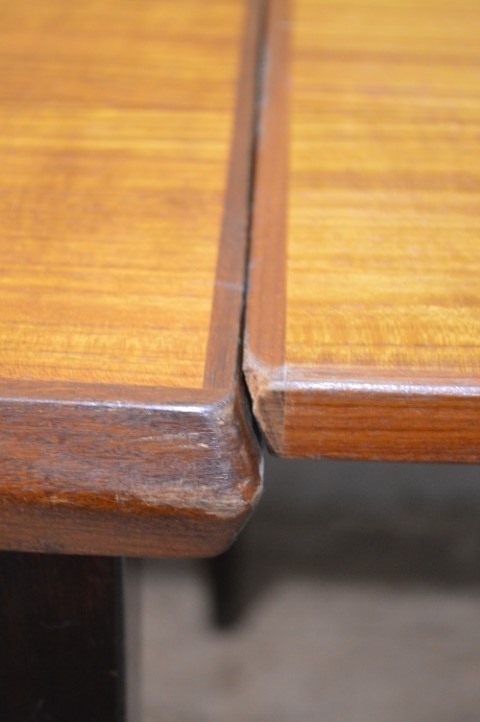 De tafel is tweedehands en heeft gebruikssporen, waaronder enkele vlekken op het blad. De poten zijn in een afwijkende kleur gebeitst, wat kenmerkend is voor de stijl uit die periode. Daarnaast is er kleurverschil tussen het hoofdblad en de uitschuifbladen, doordat deze meestal minder aan licht zijn blootgesteld.