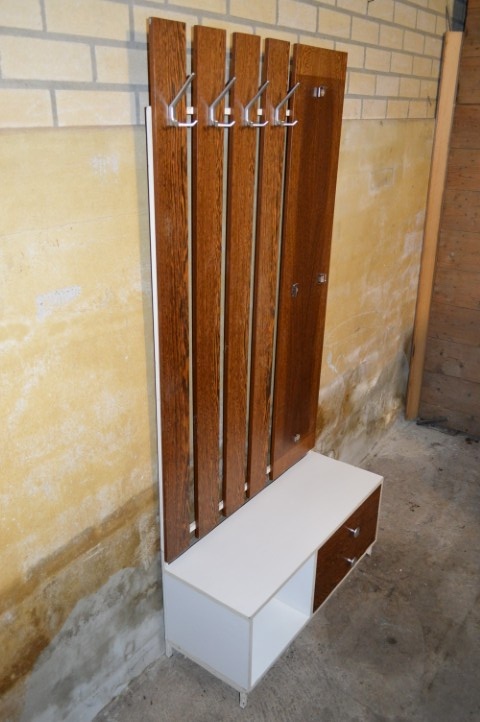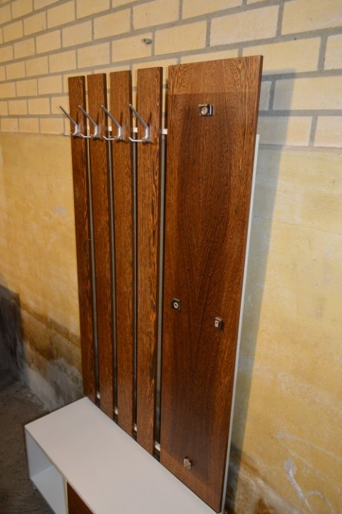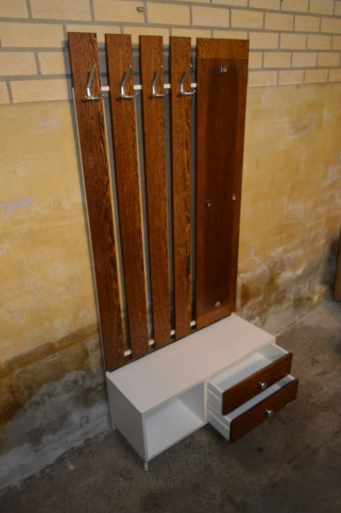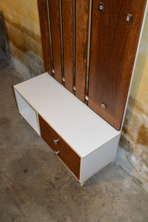 Het meubel is uitgevoerd met wengé houten latten op een metalen frame en een gefineerd ondermeubel, typerend voor het Nederlandse design uit de mid-century periode.