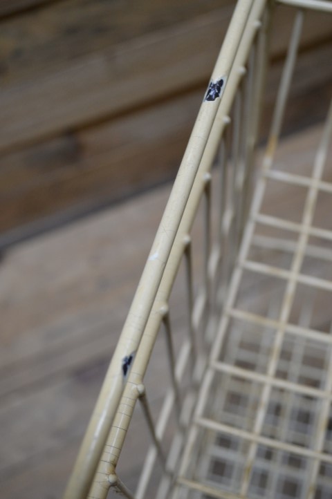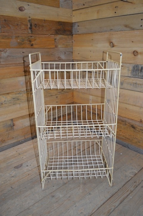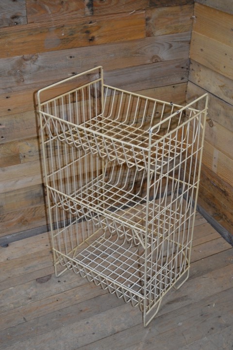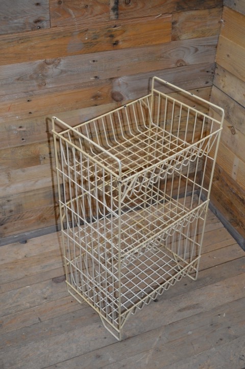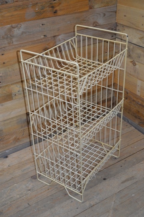 Retro draadrekje voor het bewaren van groente en fruit uit de jaren 60 en 70. De aardappels onderin, de groente in het midden en het fruit bovenop. Een kleurrijk geheel waardoor de vintage keuken werd opgefleurd.