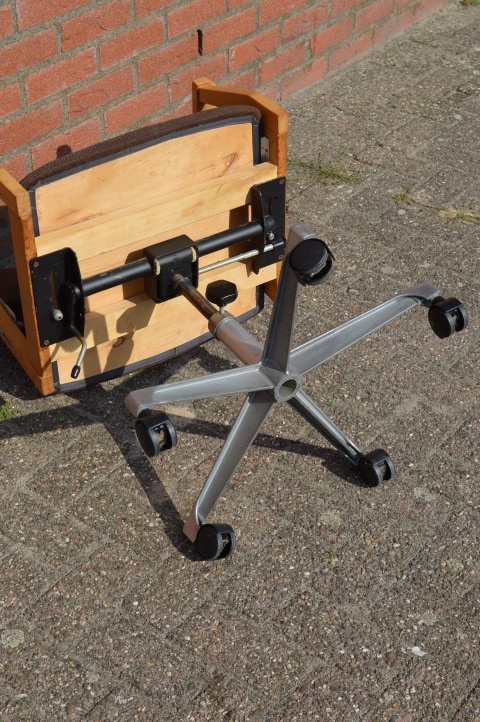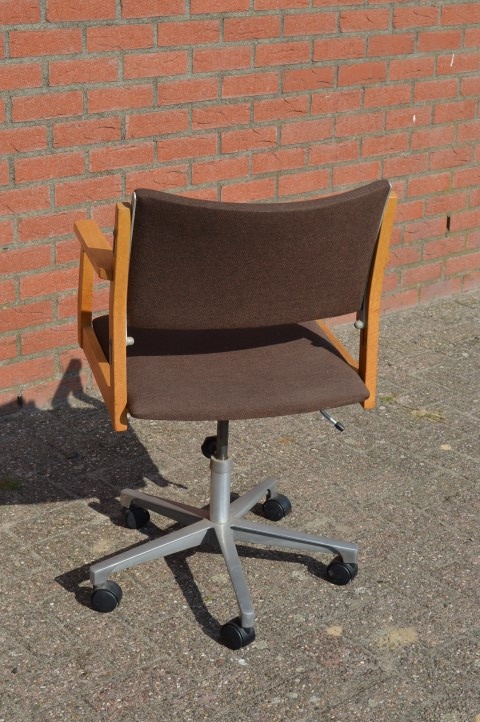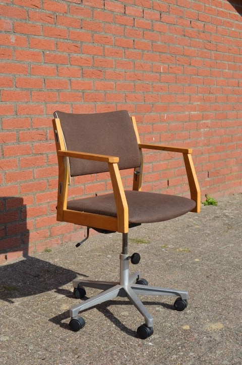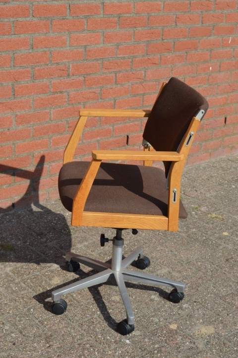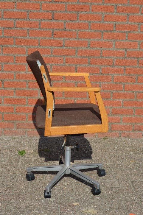 Deze mooie verstelbare retro kantoorstoel met houten armleuningen en stoffen bekleding op een metalen frame van een onbekende ontwerper is ideaal als bureaustoel voor zowel thuis als op kantoor, om op comfortabele en ergonomische wijze met de computer te kunnen werken.