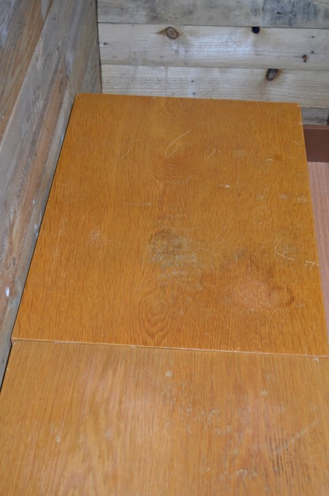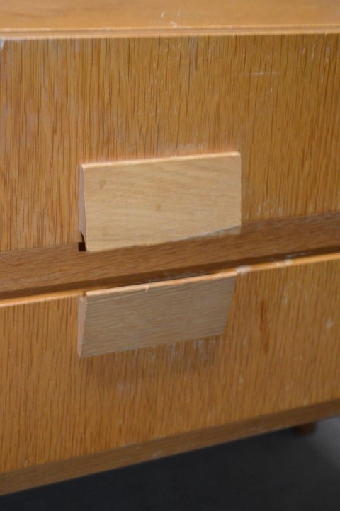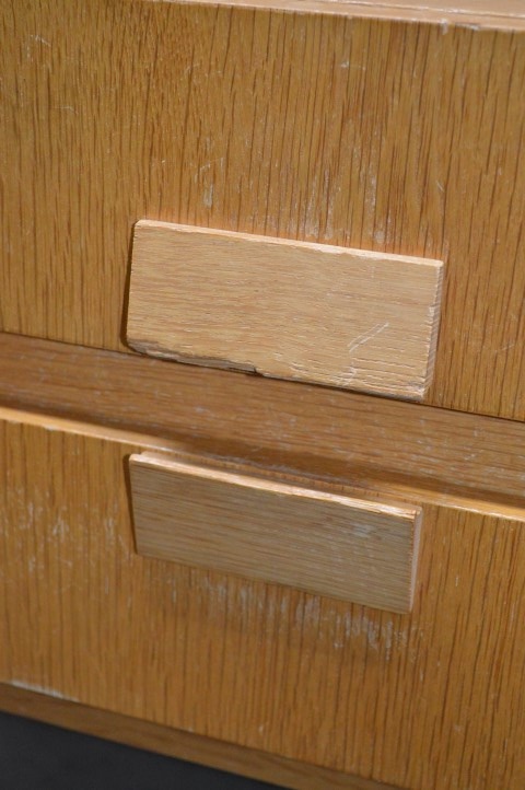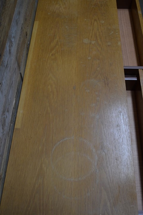 Jammer genoeg zijn er een aantal gebruikssporen. Er zitten vlekken op het blad van de kastjes, enkele handgreepjes hebben schade opgelopen door het vele gebruik en er is wat lijmwerk aan diverse laden.