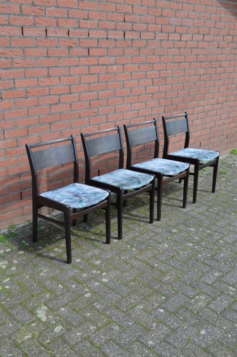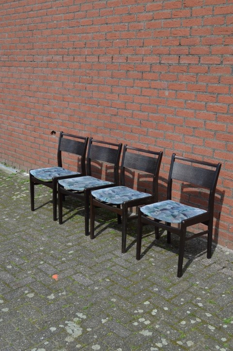 Set van 4 retro Scandinavisch design keukenstoelen van teakhout met blauw velours bekleding uit de jaren 60. Vintage design keukenstoelen die niet al te zwaar zijn en een prima zitcomfort hebben.