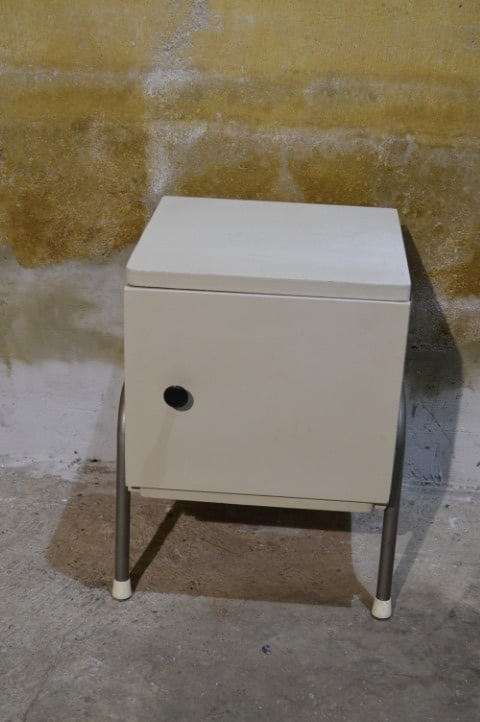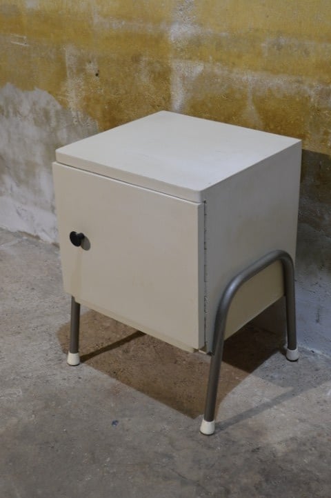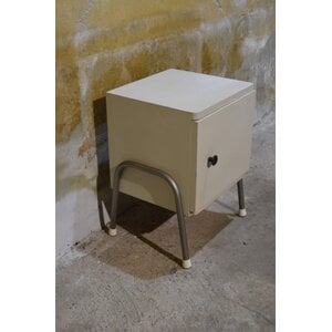 Dit retro nachtkastje met metalen poten heeft een stoere en industriële uitstraling.