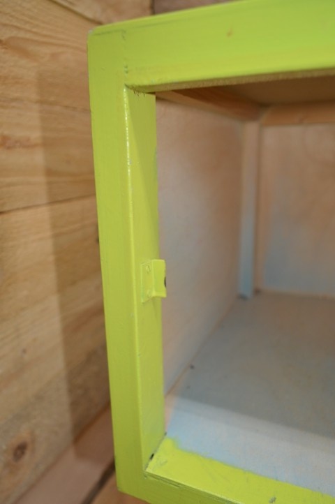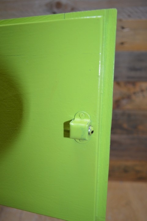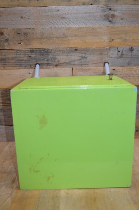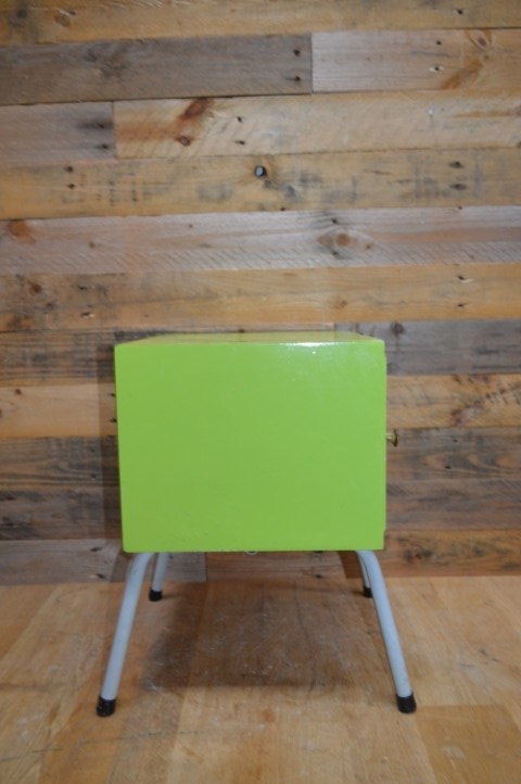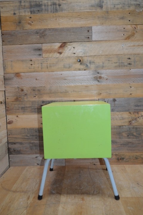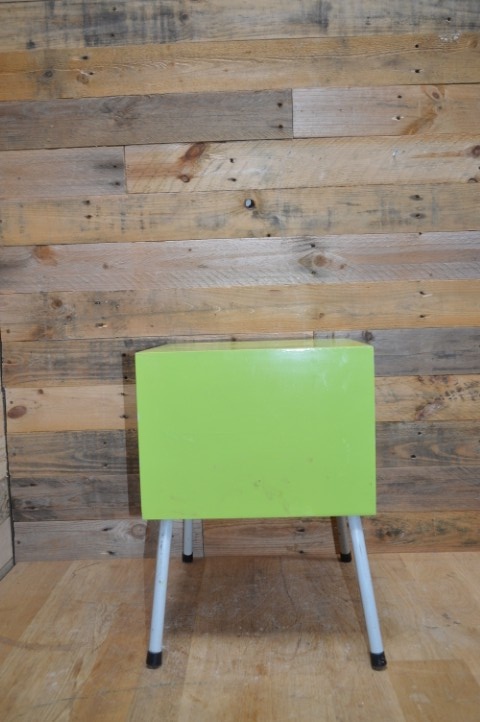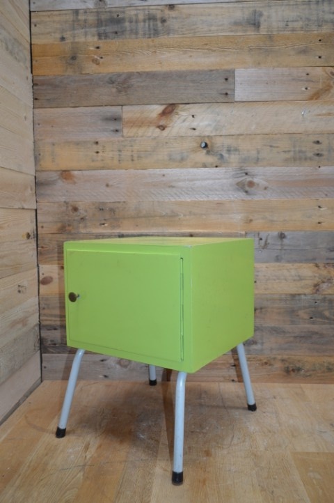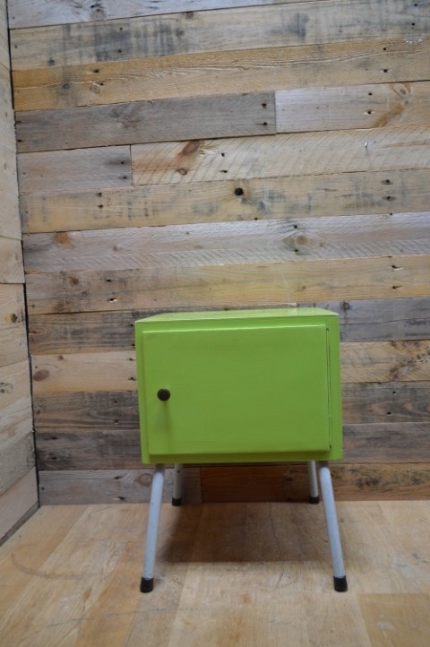 Het staat stevig op buizenpootjes en heeft een handig rechtsdraaiend deurtje. De retro nachtkastje appelgroen draagt duidelijke gebruikssporen die juist bijdragen aan de vintage charme. Perfect als eyecatcher in een retro interieur of als praktische opberger naast je bed.