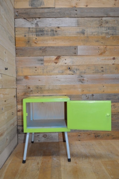 Een vrolijke blikvanger voor ieder interieur! Dit retro nachtkastje in appelgroen trekt direct de aandacht en combineert charme met praktisch gemak.