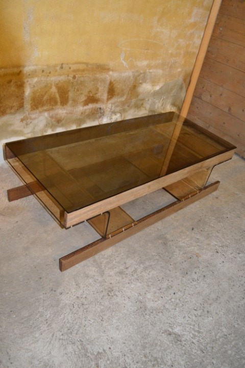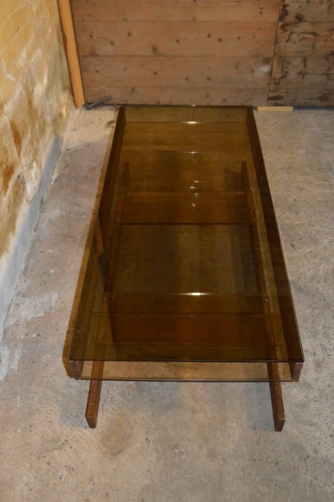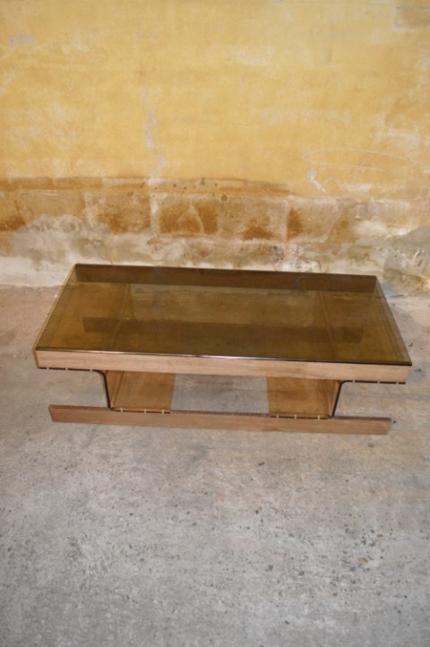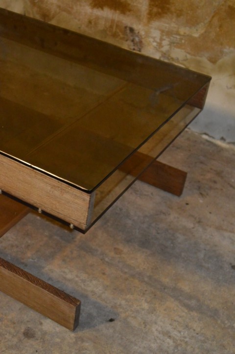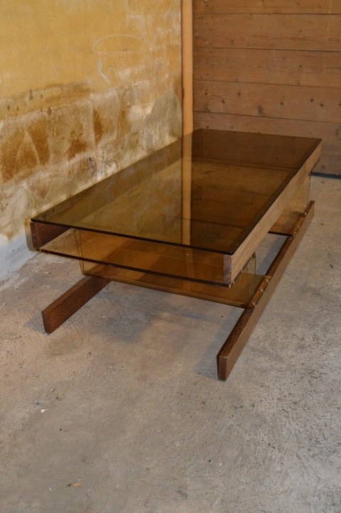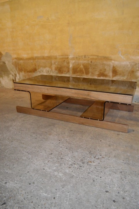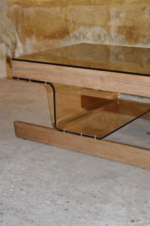 De retro tafel heeft een bijzonder onderstel van lichtbruin acryl perspex, gemonteerd op wenge houten latten. Het blad is uitgevoerd in bronskleurig rookglas, wat zorgt voor een luxe en tijdloze uitstraling.