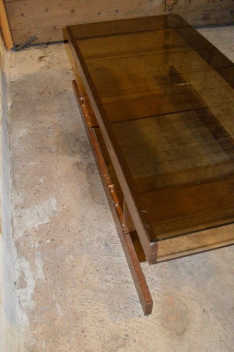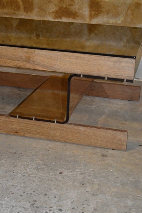 Het betreft een retro tafel met gebruikssporen passend bij leeftijd en gebruik, waaronder sporen aan het wenge houtwerk en de acryl perspex tussenstukken.