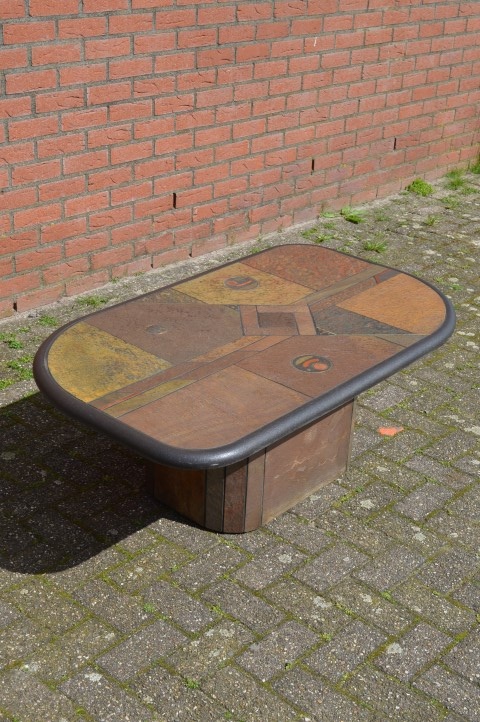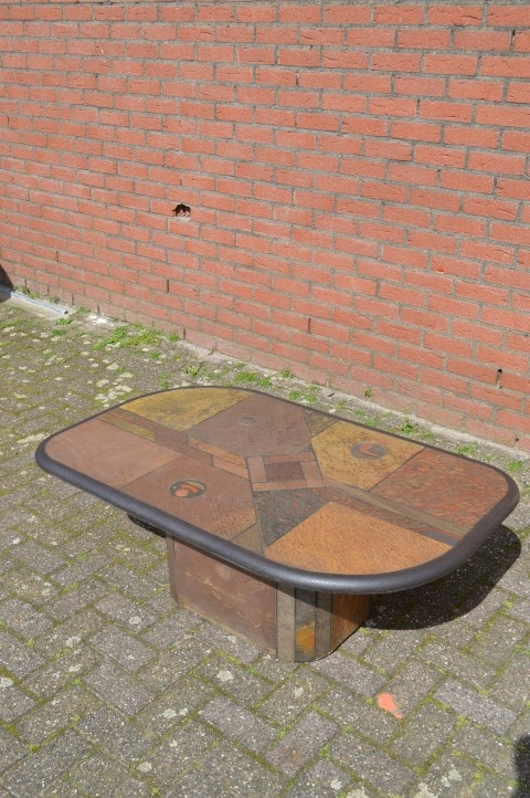 Deze betonnen salontafel van Paul Kingma is een schitterend staaltje Nederlands design uit de late jaren 70. De tafel werd ontworpen voor Fedam en is uitgevoerd in bruin beton met een abstract geometrisch patroon van inlegwerk in steen, leisteen, agaat, messing en koper. De bovenplaat is 4 cm dik en zeer zwaar — een waar kunstobject dat tegelijkertijd functioneel is. Kingma’s tafels zijn altijd uniek: elk ontwerp is met de hand gemaakt en gesigneerd.