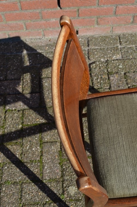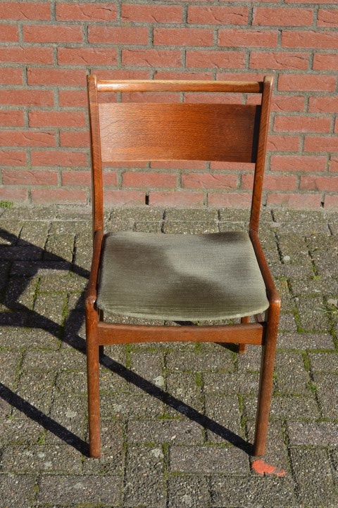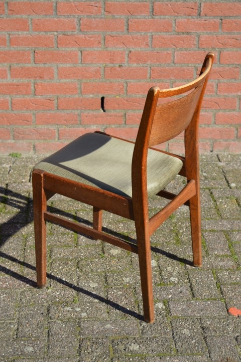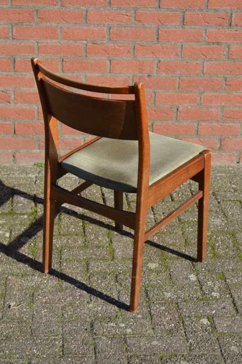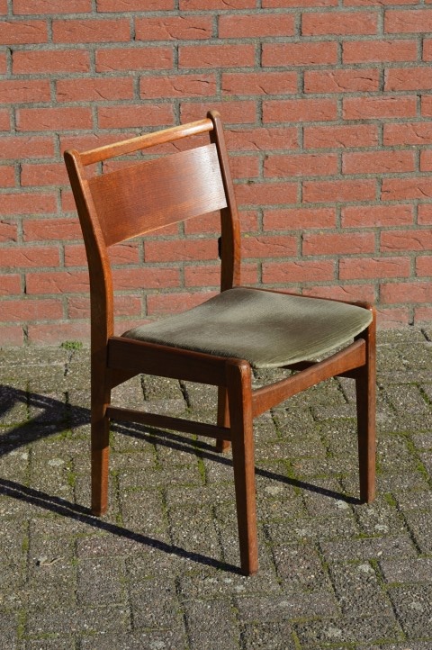 Retro Scandinavisch design eetkamerstoel gemaakt van teakhout. Vintage design stoel met een mooie combinatie van het zacht glanzende hout en de groene stof op de zitting. Handig om te gebruiken als extra keukenstoel, bijvoorbeeld voor als u gasten ontvangt, maar kan daarnaast natuurlijk ook goed in de woonkamer of slaapkamer staan.