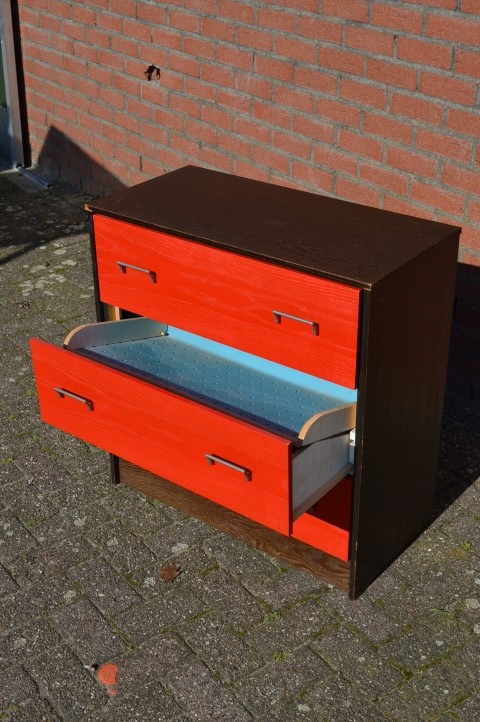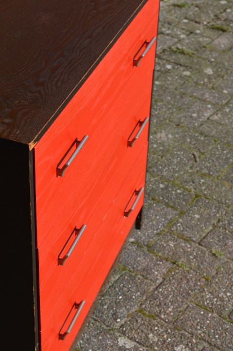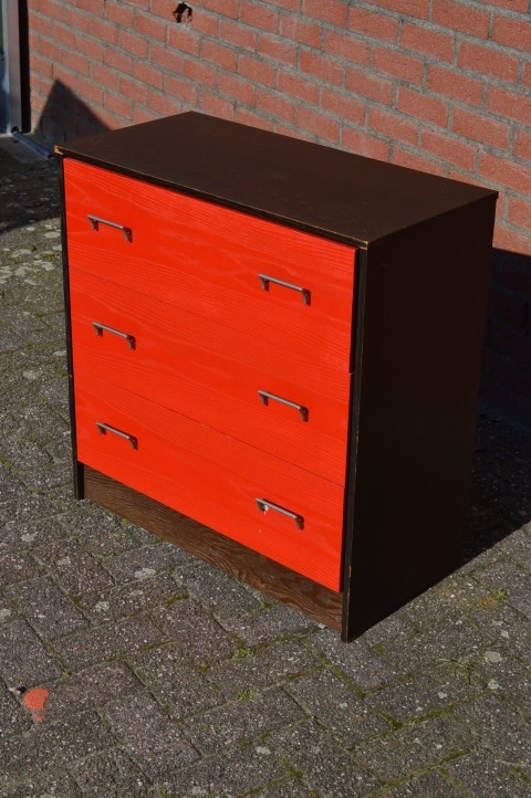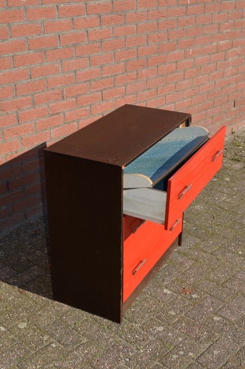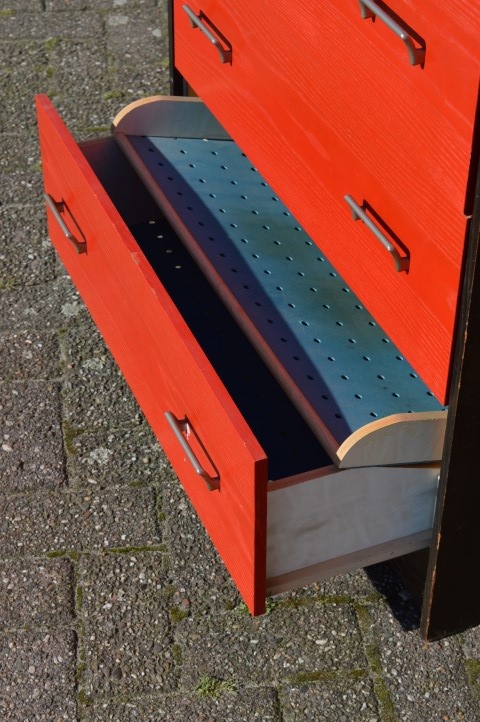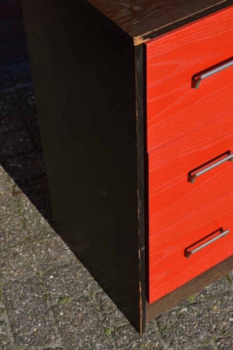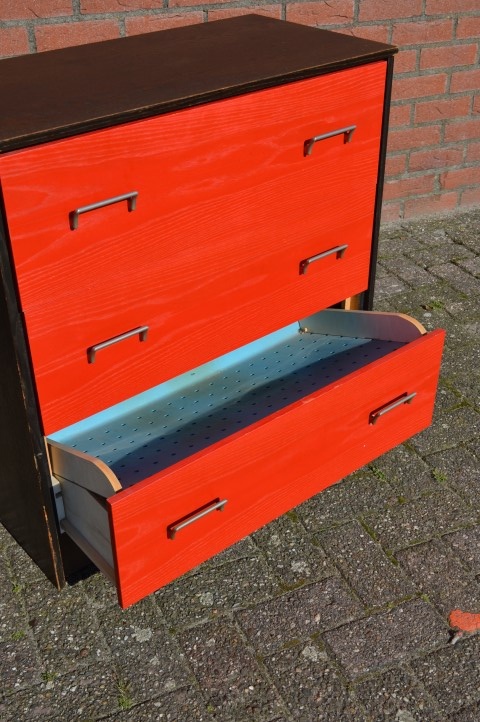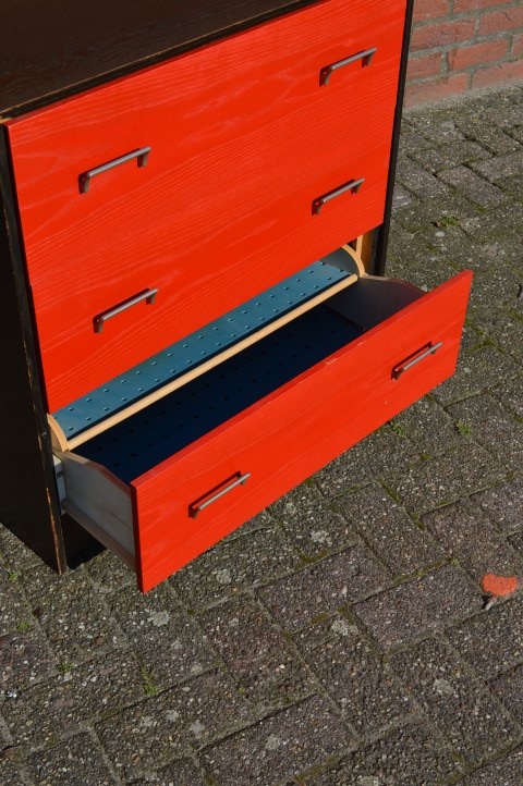 Dit mooie retro schoenenkastje van zwart en rood hout is mooi om te zien en zorgt daarnaast dat uw schoenen altijd netjes en uit het zicht worden opgeborgen wanneer deze niet in gebruik zijn. In de lades passen bovendien meerdere paren schoenen, waardoor deze kast daarnaast ook ideaal is om bijvoorbeeld door gezinnen gebruikt te worden. Elke lade heeft een dubbele bodem. Deze kunnen wat soepeler schuiven door ze in te smeren met kaarsvet of een was. Ideale kast kast voor sportschoenen en slippers.