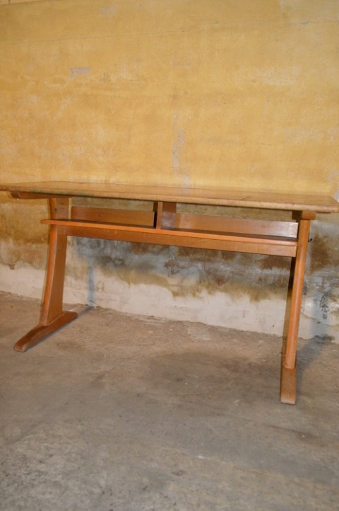 Deze vintage schooltafel is vervaardigd met een stevig beukenhouten onderstel, massief multiplex constructie en een duurzaam hardhouten fineer blad. Een robuust en degelijk ontwerp dat generaties scholieren heeft gedragen – en dat nog steeds staat als een huis. Aan de zijkanten bevinden zich de originele metalen haakjes om schooltassen aan op te hangen – een prachtig authentiek detail dat het karakter van dit meubel versterkt. CASALA, opgericht door Carl Sasse, staat wereldwijd bekend om zijn degelijke afwerking, ergonomie en tijdloze ontwerp. Dit exemplaar verkeert in originele vintage staat met normale gebruikssporen zoals krassen, schaafplekken en slijtage passend bij de leeftijd. Constructief is de tafel solide.