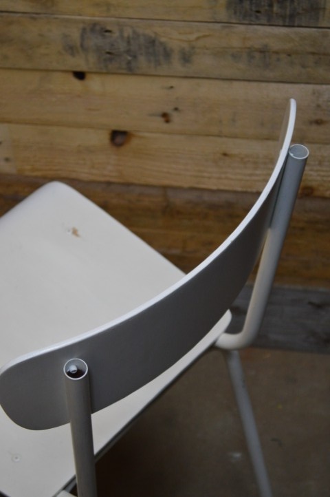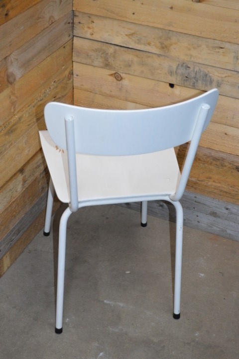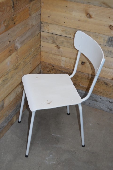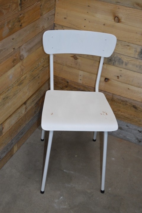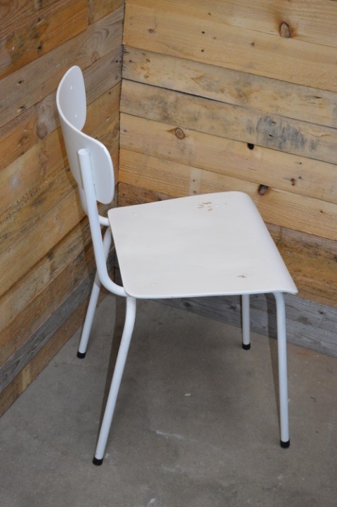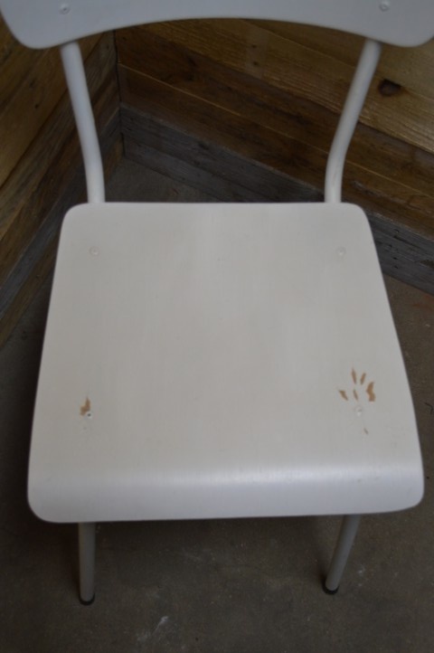 Door de jaren van gebruik heeft deze stoel hier en daar wat gebruikssporen opgelopen. De sierlijke stoel is door de vorige eigenaar wit geschilderd waarvan delen loslaten en bladderen maar desondanks is dit stoeltje nog in goede retro staat.