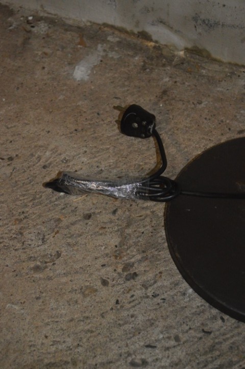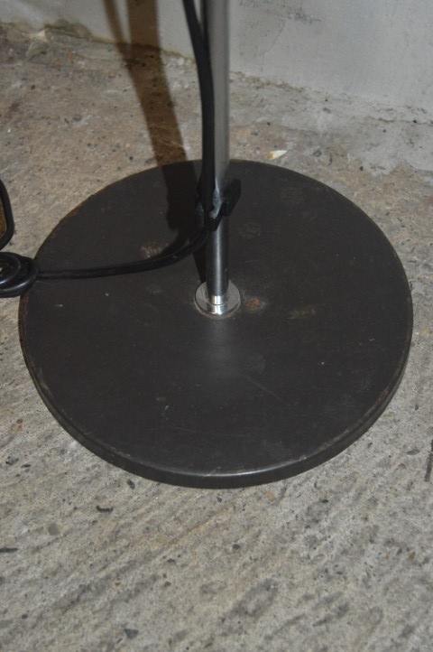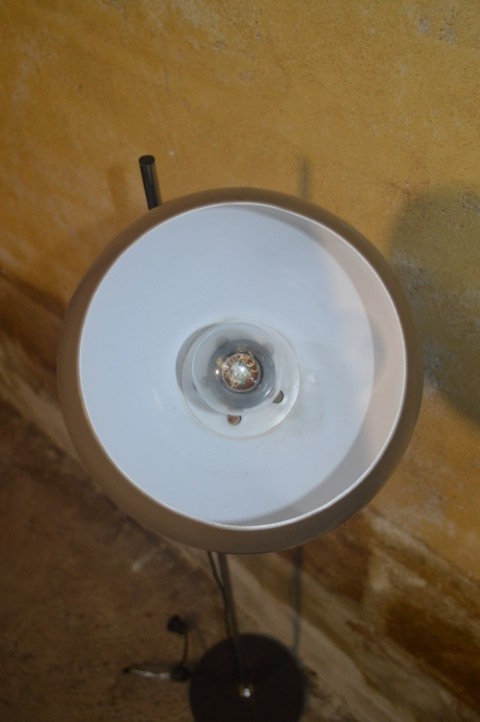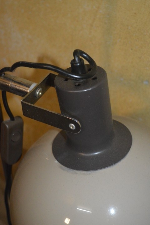 De lamp verkeert in nette gebruikte staat. Er zijn gebruikssporen aanwezig en op de voet zitten enkele roestpunten, passend bij de leeftijd en het gebruik.