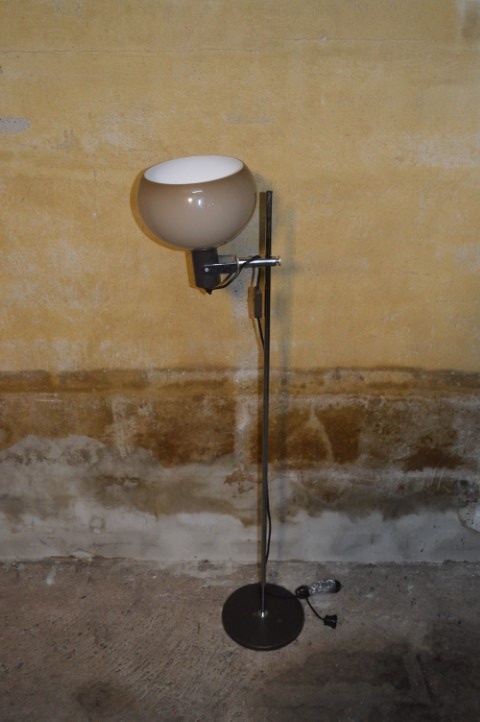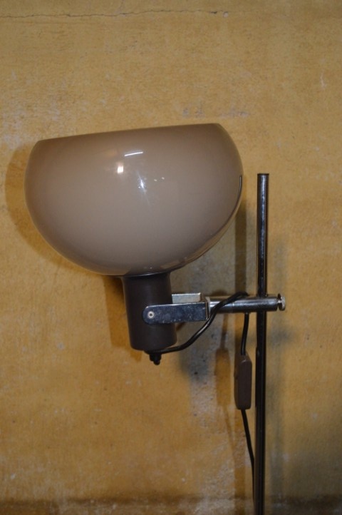 Deze retro vloerlamp heeft een karakteristieke bruine mushroom acryl kap en een verchroomde stang.