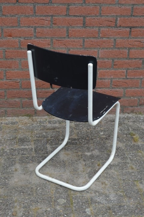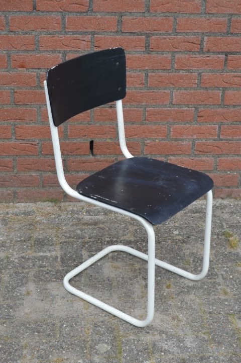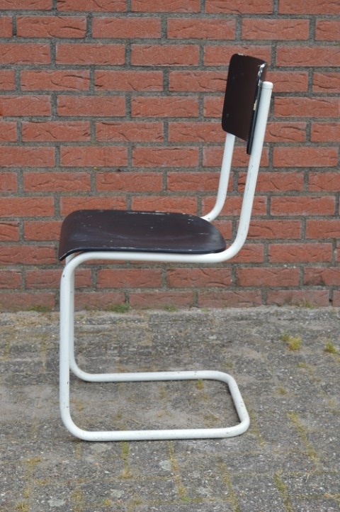 Vintage design stoel uit de jaren 60. Dit model werd gemaakt door Ahrend, een Duitse fabrikant, naar het S43 model van een Thonet stoel. Rugleuning en zitting in pagwood, een harsinjectietechniek om het hout stevigheid, elegantie en flexibiliteit te geven. Het buizenframe in van staal en in wit geschilderd. Een design stoel die vaak gebruikt wordt als slaapkamerstoel.