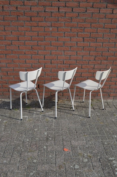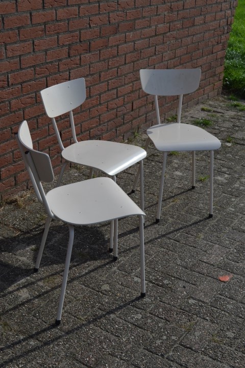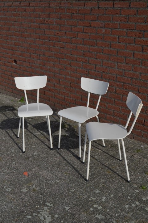 3 leuke retro schoolstoeltjes die je ook zeer goed in de woonkamer of keuken kunt gebruiken als eetkamerstoelen. Deze zijn in een witte kleur geschilderd. Door de jaren van gebruik hebben de drie stoelen hier en daar wat gebruikssporen op gelopen maar desondanks zijn deze stoelen nog zeer goed te gebruiken.