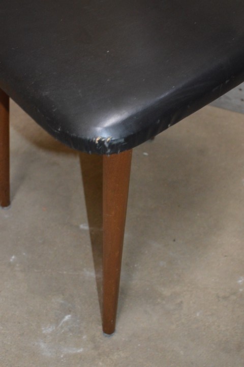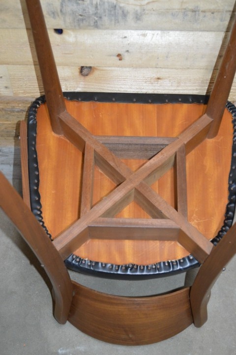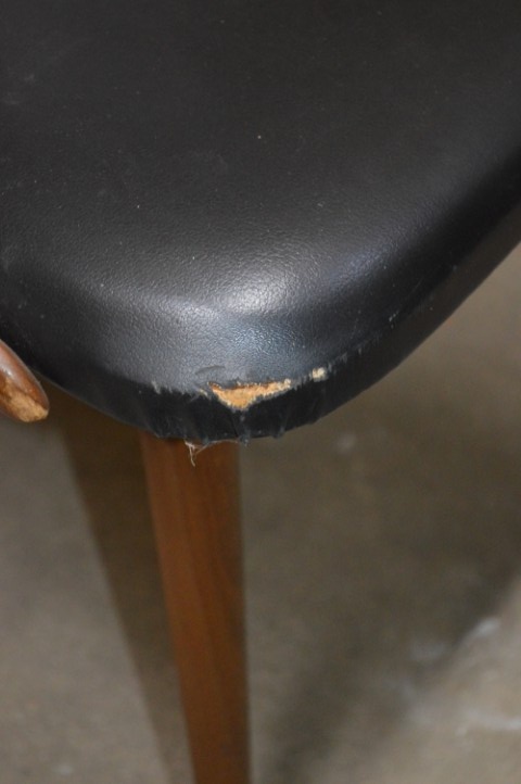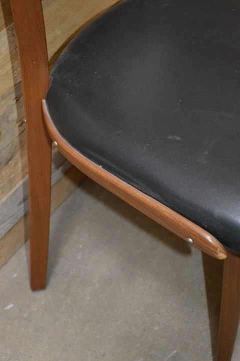 De stoel heeft gebruikssporen. Er mist 1 latje en aan de zijkant van de zitting zit een scheurtje in de skai bekleding.